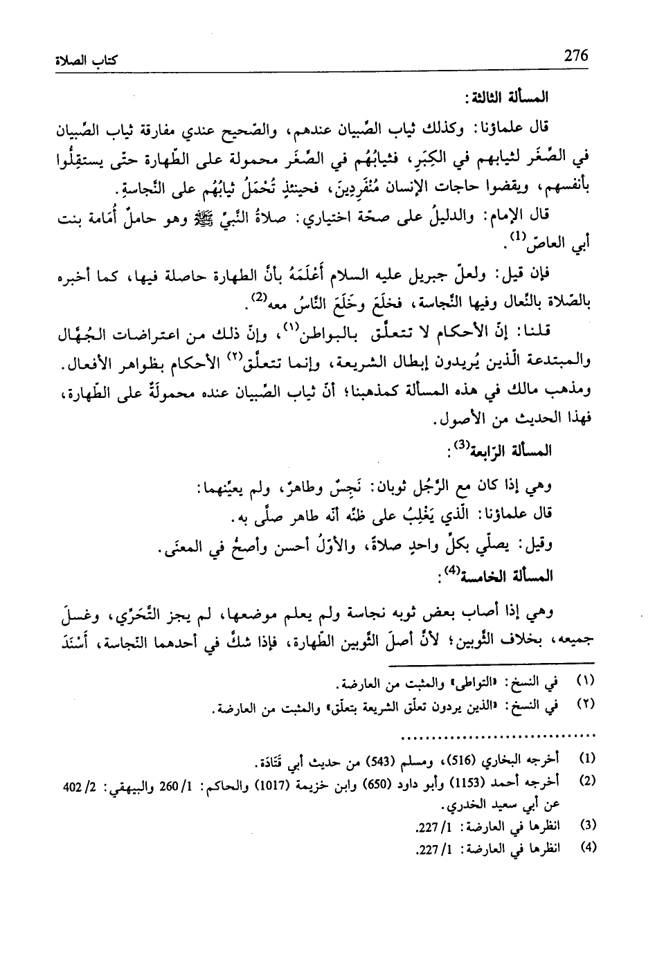 قال علماؤنا: وكذلك ثياب الصَّبيان عندهم، والصّحيح عندي مفارقة ثياب الصِّبيان في الصِّغَر لثيابهم في الكِبَرِ، فثيابُهُم في الصِّغَر محمولة على الطّهارة حتّى يستقِلُّوا بأنفسهم، ويقضوا حاجات الإنسان مُنْفَرِدين، فحينئذٍ تُحْمَلُ ثيابُهُم على النَّجاسةِ.