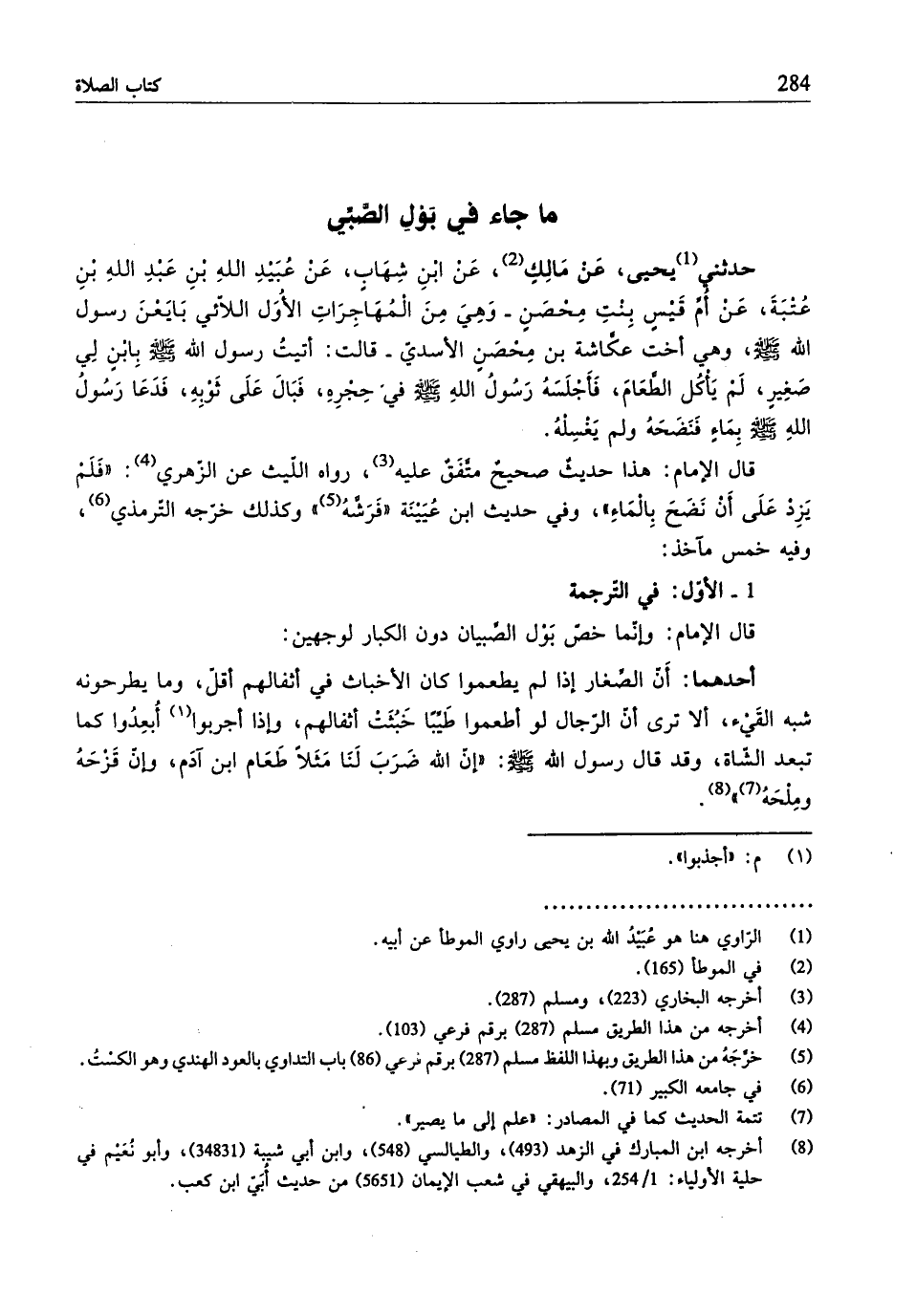 حدثني (¬1) يحيى، عَنْ مالك (¬2)، عَنْ ابْنِ شهَابٍ، عَنْ عُبَيْدِ اللهِ بْنِ عَبْدِ الله بْنِ عُتبَةَ، عَنْ أُمَّ قَيْسٍ بِنْتِ مِحْصَنٍ - وَهِيَ مِنَ الْمُهَاجراتِ الأُوَل اللاّئي بَايَعْنَ رسول الله - صلّى الله عليه وسلم -، وهي أخت عكَّاشة بن مِحْصَنٍ الأسديّ- قالت: أتيتُ رسول الله - صلّى الله عليه وسلم - بِابْنٍ لِي صَغِيرٍ، لَمْ يَأْكُل الطَّعَامَ، فَأَجْلَسَهُ رَسُولُ اللهِ - صلّى الله عليه وسلم - في "حِجْرِهِ، فَبَالَ عَلَى ثوْبِهِ، فَدَعَا رَسُولُ اللهِ - صلّى الله عليه وسلم - بِمَاءٍ فَنَضَحَهُ ولم يَغْسِلْهُ.