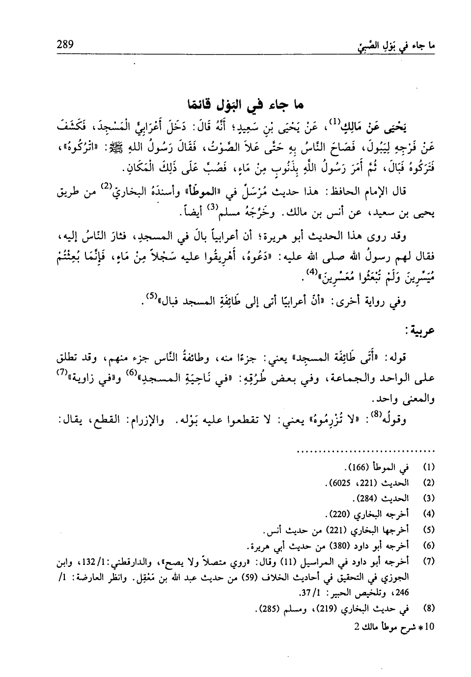 يَحْيىَ عَنْ مالكٌ (¬1)، عَنْ يَحيَى بْنِ سَعِيدٍ أَنَّهُ قَالَ: دَخَلَ أَعْرَابِيٌّ الْمسْجِدَ، فَكَشَفَ غنْ فَرْجِهِ ليَبُولَ، فَصَاحَ النَّاسُ بِهِ حَتَّى عَلَا الصَّوتُ، فَقَالَ رَسُولُ اللهِ - صلّى الله عليه وسلم -:" اترُكُوهُ"، فَتَرَكُوهُ فَبَالَ، ثُمَّ أَمَرَ رَسُولُ اللهِ بِذَنُوبٍ مِنْ مَاءٍ، فَصُبَّ عَلَى ذَلِكَ المكَانِ.
