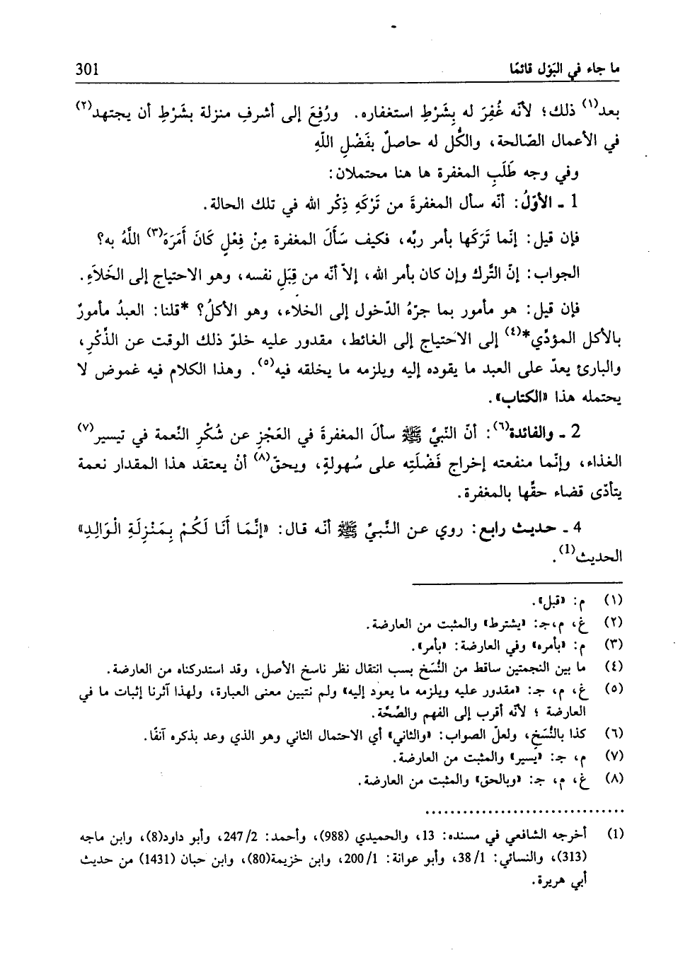 2 - والفائدة: أنّ النّبيَّ - صلّى الله عليه وسلم - سألَ المغفرةَ في العَجْزِ عن شُكرِ النِّعمة في تيسير الغذاء، وإنّما منفعته إخراج فَضْلَتَه على سُهولةٍ، ويحقّ أنّ يعتقد هذا المقدار نعمة يتأدّى قضاء حقِّها بالمغفرة.