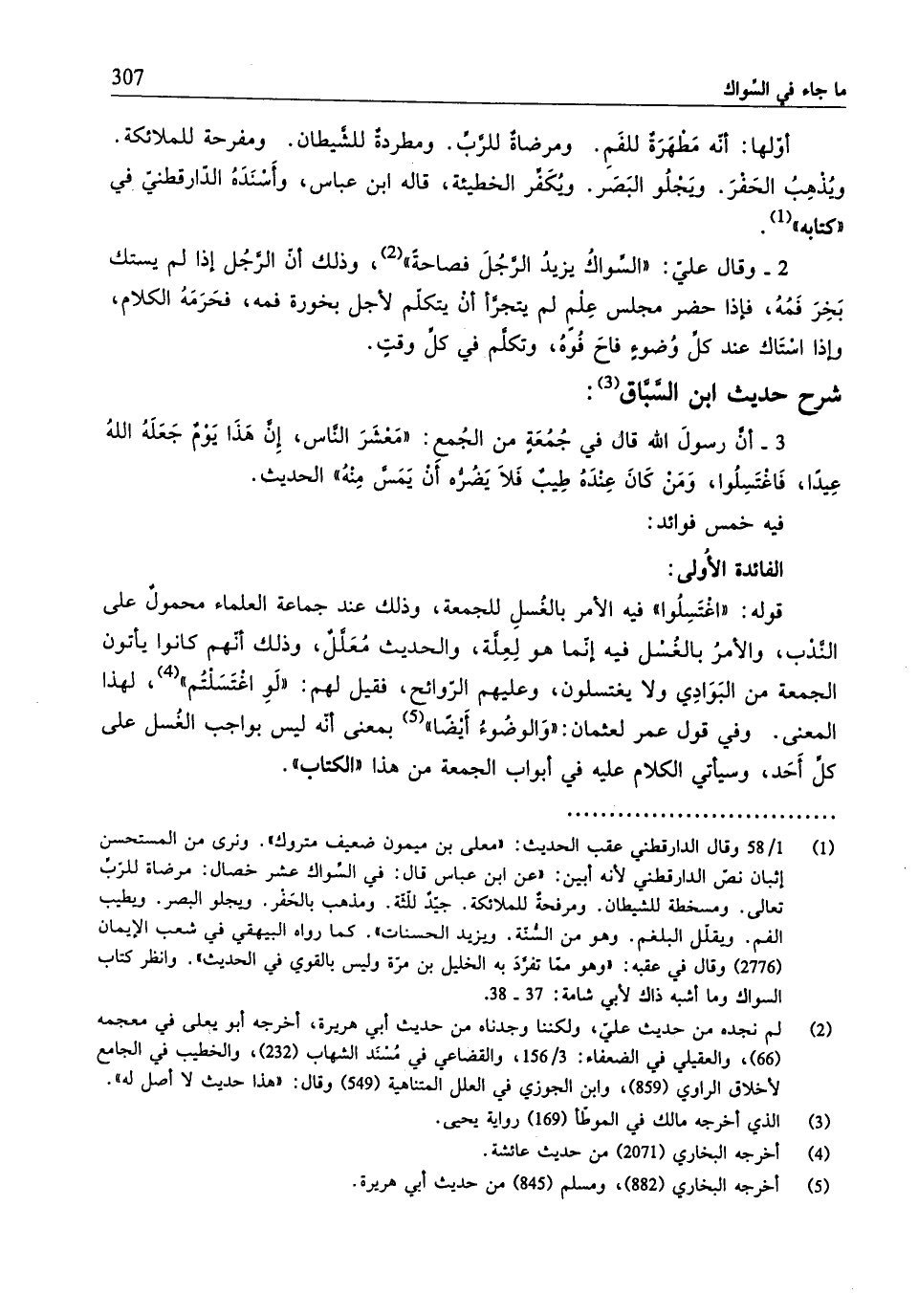(¬1) 1/ 58 وقال الدارقطني عقب الحديث: "معلي بن ميمون ضعيف متروك". ونرى من المستحسن إثبان نصّ الدارقطني لأنّه أبين: "عن ابن عبّاس قال: في السِّواك عشر خصال: مرضاة للرّبِّ تعالى. ومسخطة للشيطان. ومرفحةٌ للملائكة. جيّدٌ للّثّة. ومذهب بالحَفْر. ويجلو البصر. ويطيب الفم. ويقلّل البلغم. وهو من السُّنّة. ويزيد الحسنات". كما رواه البيهقي في شعب الإيمان (2776) وقال في عقبه: "وهو ممّا تفرَّدَ به الخليل بن مرّة وليس بالقوي في الحديث". وانظر كتاب السواك وما أشبه ذاك لأبي شامة: 37 - 38.
