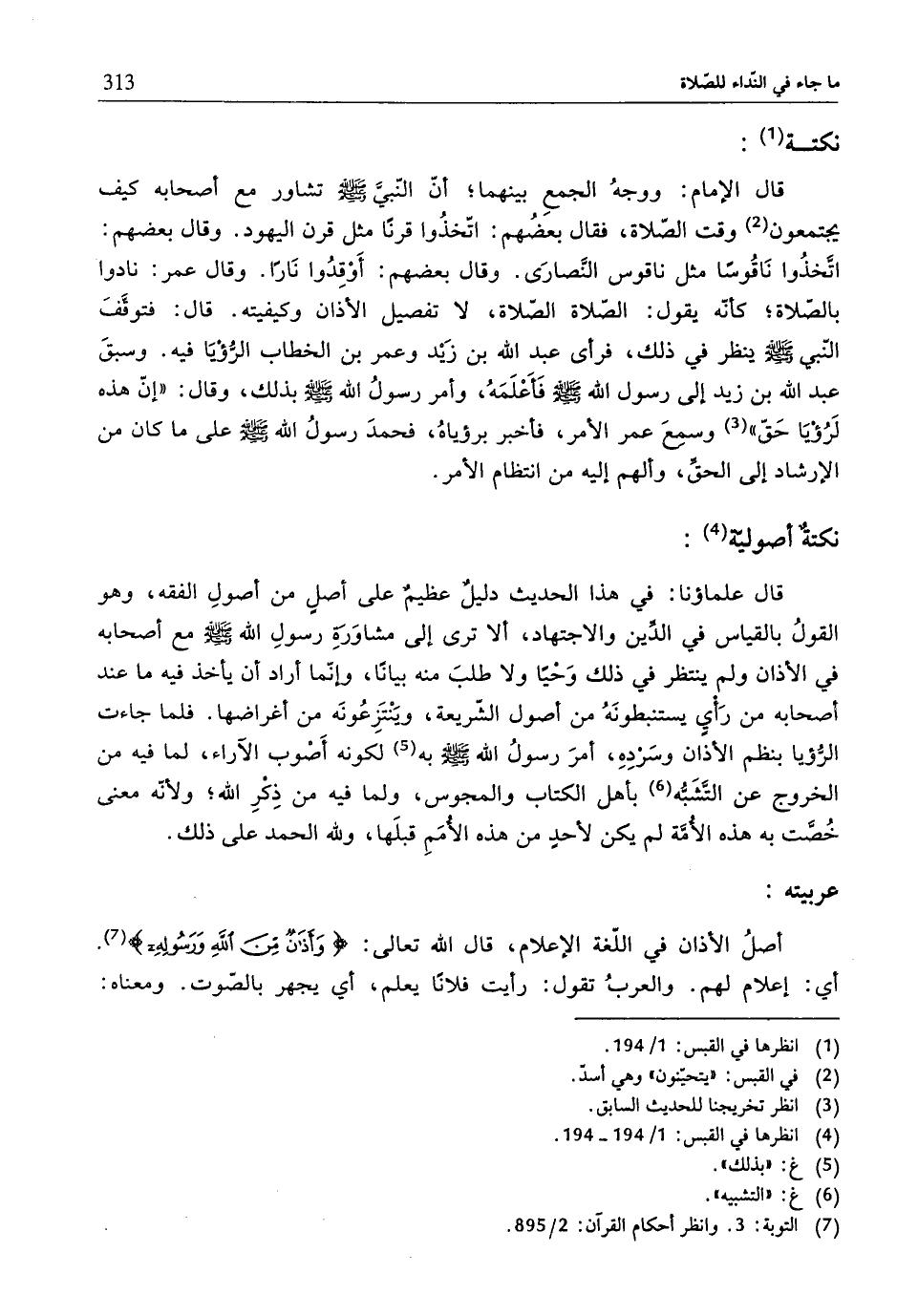 قال الإمام: ووجهُ الجمعِ بينهما؛ أنّ النّبىَّ - صلّى الله عليه وسلم - تشاور مع أصحابه كيف يجتمعون (¬2) وقت الصّلاة، فقال بعضُهم: اتّخذُوا قرنًا مثل قرن اليهود. وقال بعضهم: اتَّخذُوا نَاقُوسًا مثل ناقوس النَّصارَى. وقال بعضهم: أَوْقِدُوا نَارًا. وقال عمر: نادوا بالصّلاة؛ كانّه يقول: الصّلاة الصّلاة، لا تفصيل الأذان وكيفيته. قال: فتوقَّفَ النّبي - صلّى الله عليه وسلم - ينظر في ذلك، فرأى عبد الله بن زَيْد وعمر بن الخطّاب الرُّؤيَا فيه. وسبقَ عبد الله بن زيد إلى رسول الله - صلّى الله عليه وسلم - فَأَعْلَمَهُ، وأمر رسولُ الله - صلّى الله عليه وسلم - بذلك، وقال: "إنّ هذه لَرُؤيَا حَقّ" (¬3) وسمعَ عمر الأمر، فأخبر برؤياهُ، فحمدَ رسولُ الله - صلّى الله عليه وسلم - على ما كان من الإرشاد إلى الحقِّ، وألهم إليه من انتظام الأمر.