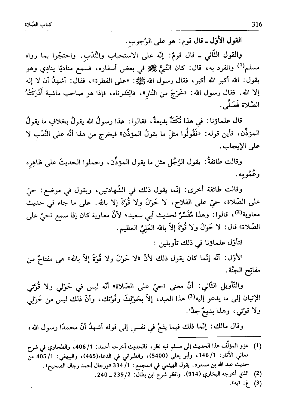 والتأويل الثّاني: أنّ معنى "حى على الصّلاة" أنّه ليس في حَوْلي ولا قُوَّتي الإتيان إلى ما يدعو إليه (¬3) هذا العبد، إلَّا بحَوْلكَ وقُوَّتك، وأنّ ذلك ليس من حَوْلِي ولا قوّتي، وهذا بديعٌ جدًّا.