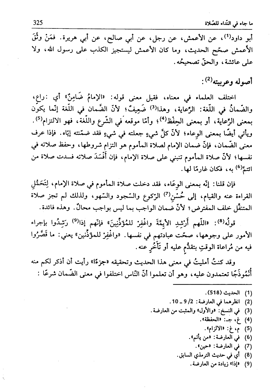 اختلف العلماء في معناه، فقيل معنى قوله: "الإمامُ ضَامِنٌ" أي: راعِ، والضّمانُ في اللّغة: الرِّعاية، وهذا (¬3) ضَعِيفٌ؛ لأنّ الضَّمان في اللّغة إنّما يكون بمعنى الرِّعاية، أو بمعنى الحِفْظ (¬4)؛ وأمّا موقعه في الشّرع واللّغة، فهو الالتزام (¬5). ويأتي أيضًا بمعنى الوِعاء؛ لأنّ كلّ شيءٍ جعلته في شيءٍ فقد ضمّنته إيّاه. فإذا عرف معنى الضّمان، فإنّ ضمان الإمام لصلاة المأموم هو التزام شروطها، وحفظ صلاته في نفسها؛ لأنّ صلاة المأموم تنبني على صلاة الإمام، فإن أَفْسَدَ صلاته فسدت صلاة من ائتمَّ (¬6) به، فكان غارمًا لها.