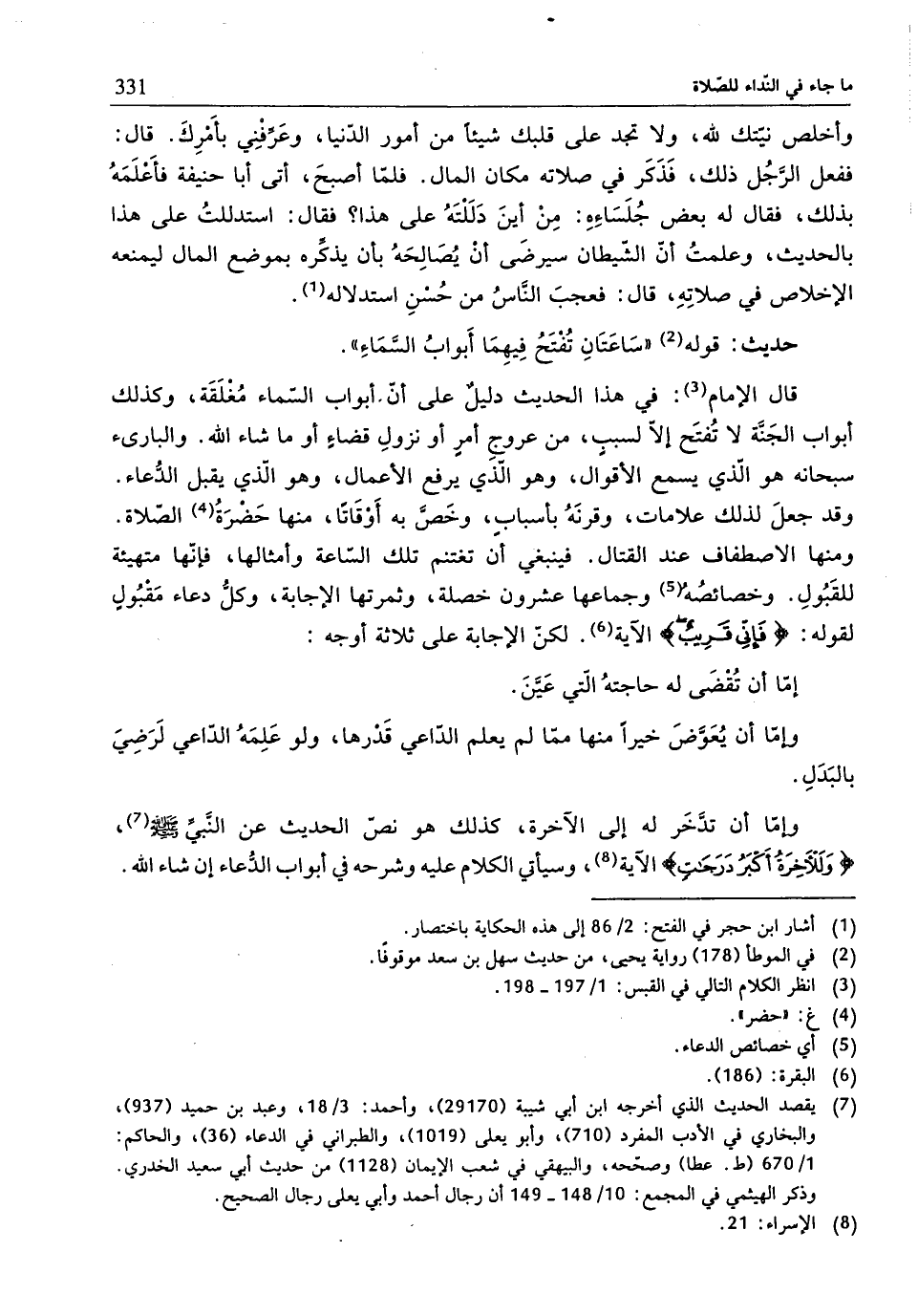 قال الإمام (¬3): في هذا الحديث دليلٌ على أنّ أبواب السّماء مُغْلَقَة، وكذلك أبواب الجَنَّة لا تُفتَح إلّا لسببٍ، من عروجِ أمرٍ أو نزولِ قضاءٍ أو ما شاء الله. والبارىء سبحانه هو الّذي يسمع الأقوال، وهو الّذي يرفع الأعمال، وهو الّذي يقبل الدُّعاء. وقد جعلَ لذلك علامات، وقرنَهُ بأسبابٍ، وخَصَّ به أَوْقَاتًا، منها حَضرَةُ (¬4) الصّلاة. ومنها الاصطفاف عند القتال. فينبغي أنّ تغتنم تلك السّاعة وأمثالها، فإنّها متهيئة للقَبُولِ. وخصائصُهُ (¬5) وجماعها عشرون خصلة، وثمرتها الإجابة، وكلُّ دعاء مَقْبُولٍ لقوله: {فَإِنِّي قَرِيبٌ} الآية (¬6). لكنّ الإجابة على ثلاثة اوجه: