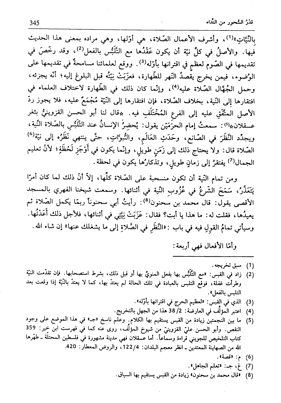 بِالنِّيَّاتِ" (¬1)، وأشرف الأعمال الصّلاة، هي أوّلها، وهي مراده بمعنى هذا الحديث فيها. والأصلُ في كلِّ نيّة أنّ يكون عَقْدُها مع التَلَبُّس بالفعل (¬2)، وقد رخّصَ في تقديمها في الصّوم لعظمٍ في اقترانها بأوّله (¬3). ووقع لعلمائنا مسامحةٌ في تقديمها على الوُضوء، فيمن يخرج يقصدُ النّهر للطّهارة، فعزَبَتْ نِيّتُه قبل البلوغ إليه؛ أنّه يجزئه، وحمل الجُهَّال الصّلاة عليه (¬4)، وإنّما كان ذلك في الطّهارة لاختلاف العلماء في افتقارها إلى النّية، بخلاف الصّلاة، فإن افتقارها إلى النّيّة مُجْمَعٌ عليه، فلا يجوز ردّ الأصل المتَّفَقِ عليه إلى الفرعِ المُختَلَفِ فيه. *قال لنا أبو الحسن القزوينيُّ بثغر عسقلان* (¬5): سمعتُ إمام الحرَمَين يقول: يُحضِرُ الإنسانُ عند التَلَبُّسِ بالصّلاة النِّية، ويجدِّد النَّظَرَ في الصّانع، وحَدَثِ العَالَمِ، والنُّبوَّاتِ، حتَّى ينتهي نَظَرُه إلى نيّة (¬6) الصّلاة قال: ولا يحتاج ذلك إلى زَمَنٍ طويلِ، وإنمّا يكون في أَوْجَزِ لَحْظَةٍ؛ لأنّ تعليم الجمال (¬7) يفتقرُ إلى زمانٍ طويلٍ، وتذكارُها يكون في لحظة.