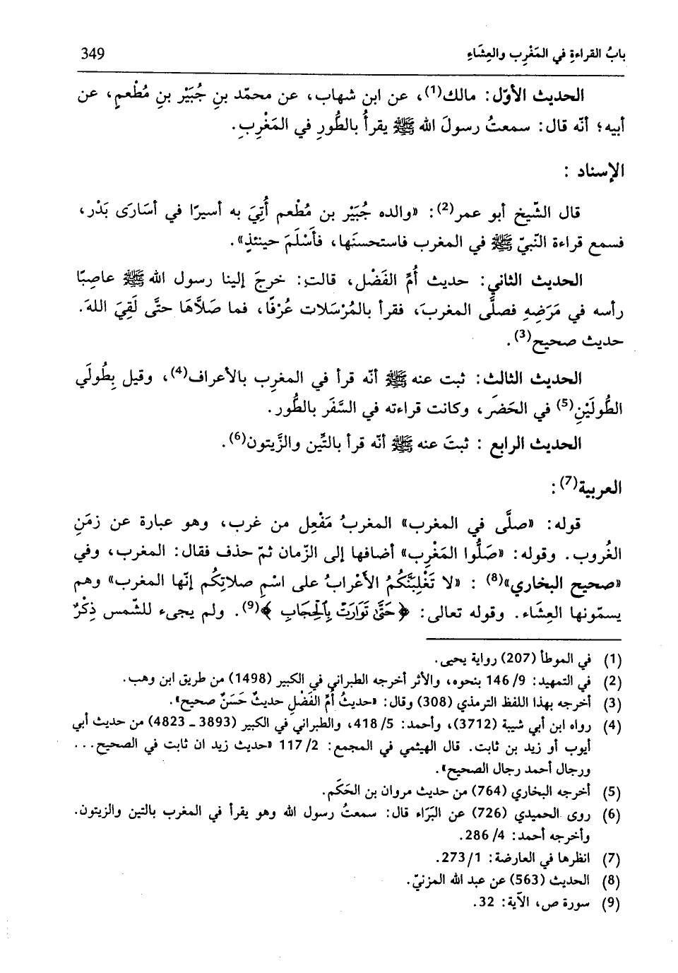 الحديث الأوّل: مالكٌ (¬1)، عن ابن شهاب، عن محمّد بنِ جُبَيرْ بنِ مُطعمِ، عن أبيه؛ أنّه قال: سمعتُ رسولَ الله - صلّى الله عليه وسلم - يقرأُ بالطُورِ في المَغْرِبِ.