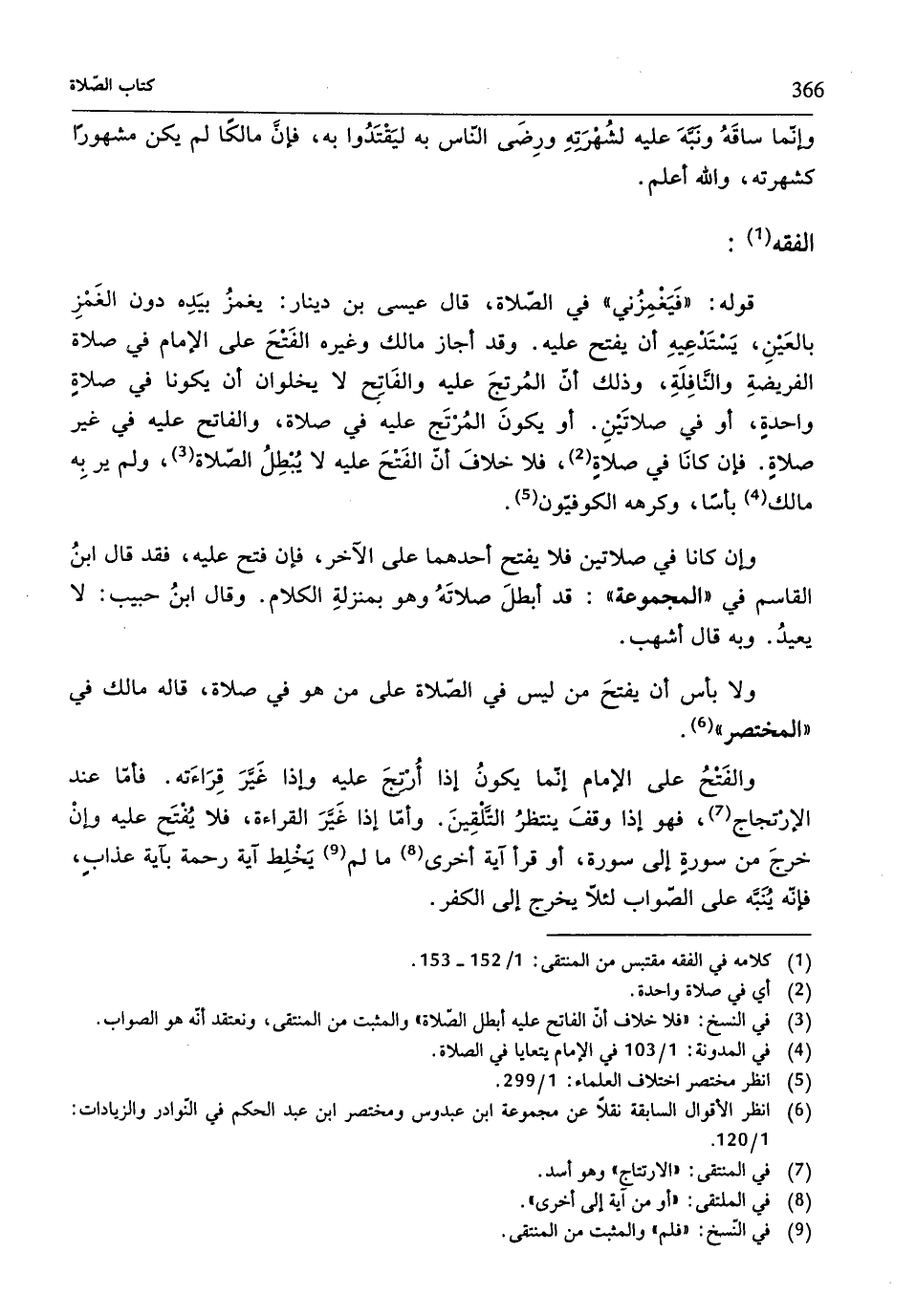(¬3) في النسخ: "فلا خلاف أنّ الفاتح عليه أبطل الصّلاة" والمثبت من المنتقى، ونعتقد أنّه هو الصواب.