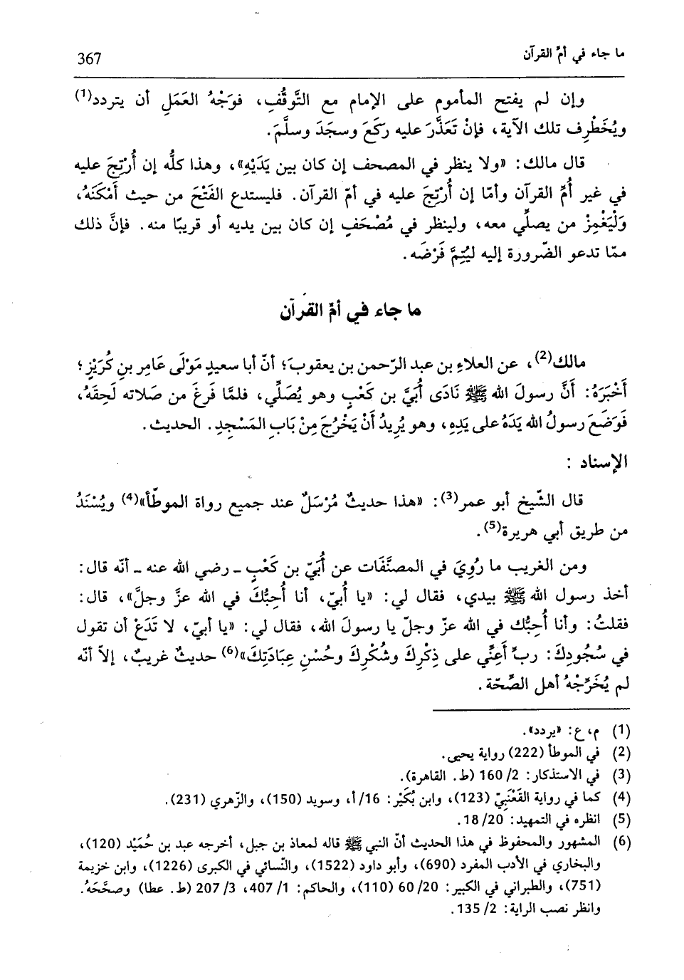 قال الشّيخ أبو عمر (¬3): "هذا حديثٌ مُرْسَلٌ عند جميع رواة الموطّأ" (¬4) ويُسْنَدُ من طريق أبي هريرة (¬5). ومن الغريب ما رُوِيَ في المصنَّفَات عن أُبيّ بن كَعْبِ - رضي الله عنه - أنّه قال: أخذ رسول الله - صلّى الله عليه وسلم - بيدي، فقال لي: "يا أُبىّ، أنا أُحِبُّكَ في الله عَزَّ وَجَلَّ"، قال: فقلتُ: وأنا أُحِبُّك في الله عَزَّ وَجَلَّ يا رسولَ الله، فقال لي: "يا أُبىّ، لا تَدَعْ أنّ تقول في سُجُودِكَ: ربِّ أَعِنِّي على ذِكْرِكَ وشُكْرِكَ وحُسْنِ عِبَادَتِكَ" (¬6) حديث غريبٌ، إلَّا أنَّه لم يُخَرِّجْهُ أهل الصِّحّة.