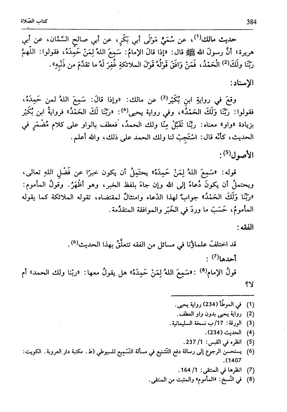 حديث مالكٌ (¬1)، عن سُمَيٍّ مَوْلَى أبي بَكرٍ، عن أبي صالحٍ السَّمَّان، عن أبي هريرة؛ أنّ رسولَ الله - صلّى الله عليه وسلم - قال:، إذا قالَ الإمامُ: سَمِعَ اللهُ لِمَنْ حَمِدَهُ، فقولوا: اللهمَّ ربَّنَا ولَكَ (¬2) الحَمدُ، فَمَن وَافَقَ قَوْلُهُ قَولَ الملائكةِ غُفِرَ لَهُ ما تقدَّمَ من ذَنْبِهِ".