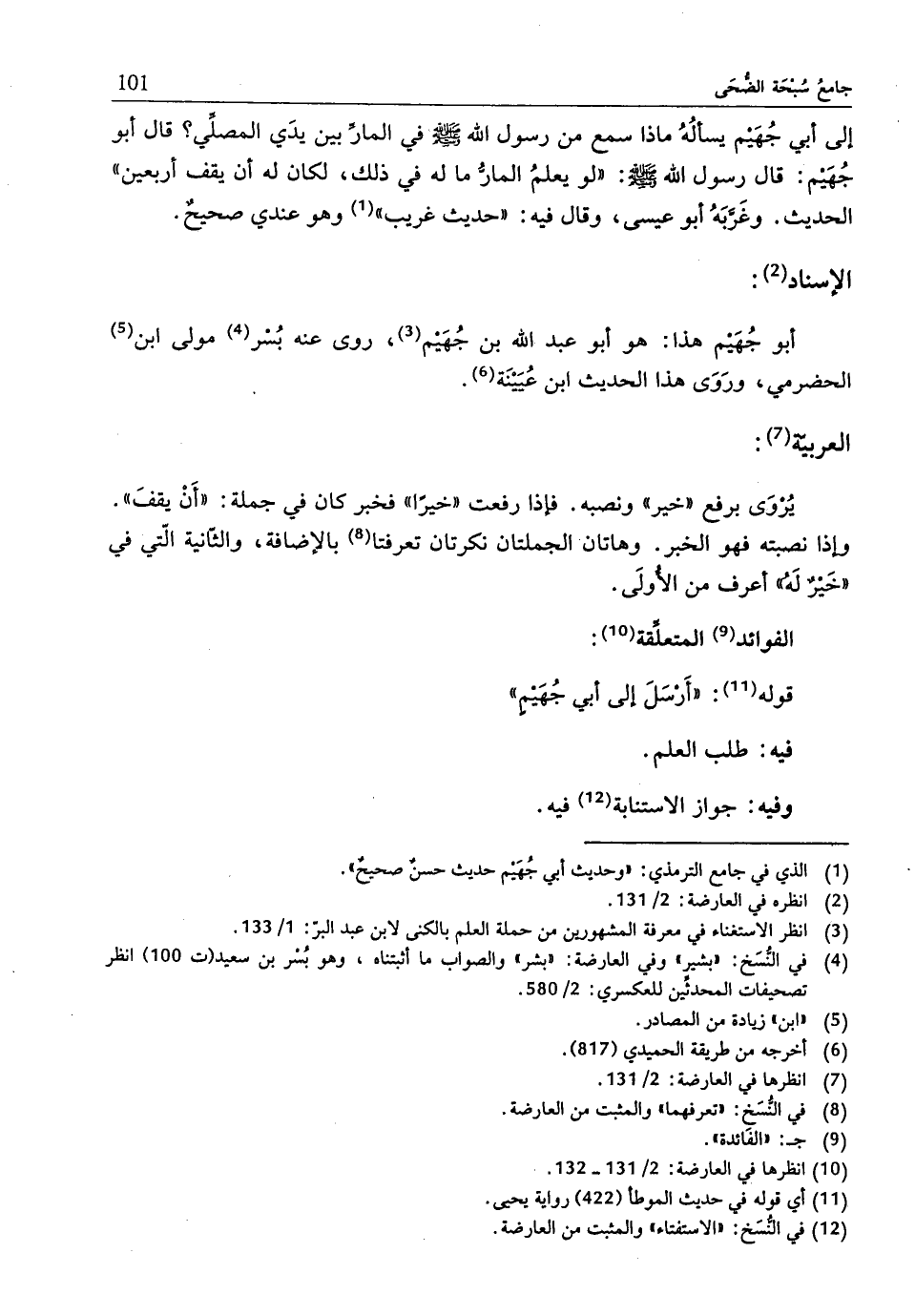 إلى أبي جُهَيْم يسألُهُ ماذا سمع من رسول الله - صلّى الله عليه وسلم - في المارِّ بين يدَي المصلِّي؟ قال أبو جُهَيْم: قال رسول الله - صلّى الله عليه وسلم -: "لو يعلمُ المارُّ ما له في ذلك، لكان له أنّ يقف أربعين" الحديث. وغَرَّبَهُ أبو عيسى، وقال فيه: "حديث غريب" (¬1) وهو عندي صحيحٌ.