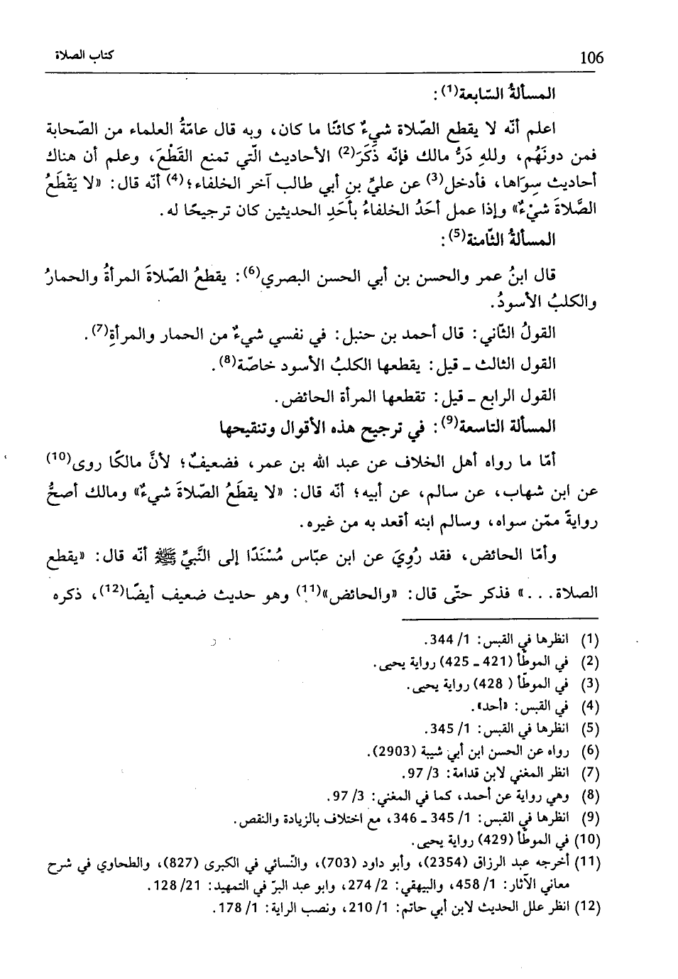 اعلم أنّه لا يقطع الصّلاة شيءٌ كائنًا ما كان، وبه قال عامّةُ العلماء من الصّحابة فمن دونَهُم، وللهِ دَرُّ، مالكٌ فإنه ذَكَرَ (¬2) الأحاديث الّتي تمنع القَطعَ، وعلم أنّ هناك أحاديث سِوَاها، فأدخل (¬3) عن عليَّ بن أبي طالب آخر الخلفاء؛ (¬4) أنّه قال: "لا يَقْطَعُ الصَّلاةَ شيْءٌ" وإذا عمل أحَدُ الخلفاءُ بأحَدِ الحديثين كان ترجيحًا له.