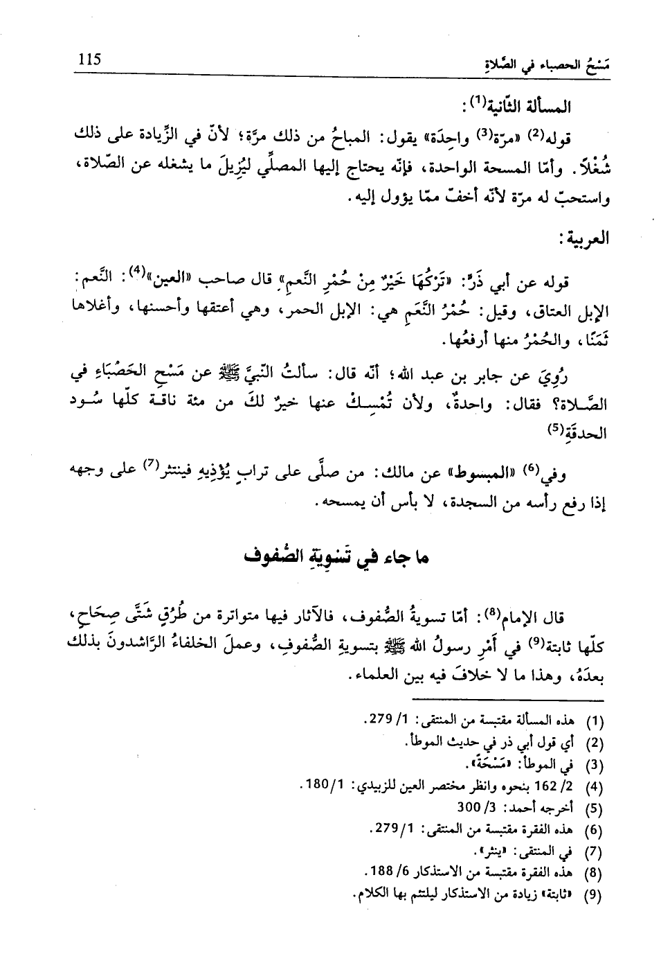 رُوِيَ عن جابر بن عبد الله؟ أنّه قال: سألتُ النّبيَّ - صلّى الله عليه وسلم - عن مَسْحِ الحَصُبَاءِ في الصَّلاة؟ فقال: واحدةٌ، ولأن تُمْسِكْ عنها خيرٌ لكَ من مئة ناقة كلّها سُود الحدقَةِ (¬5)
