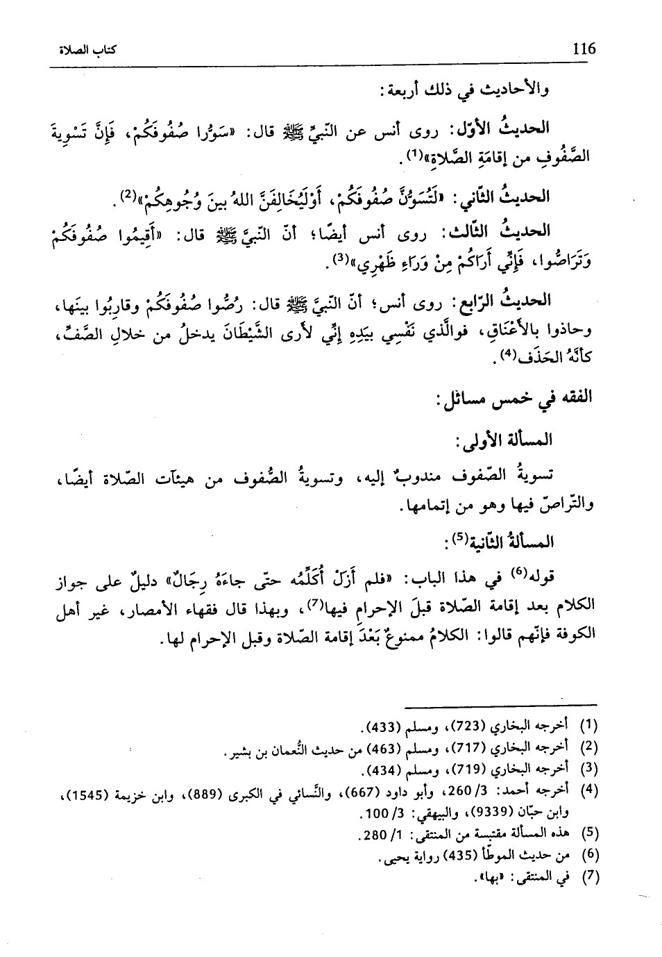 الحديثُ الأوّل: روى أنس عن النّبيِّ - صلّى الله عليه وسلم - قال: "سَوُّا صُفُوفَكُمْ، فَإِن تَسْوِيةَ الصَّفُوفِ من إقامَةِ الصَّلاةِ" (¬1).