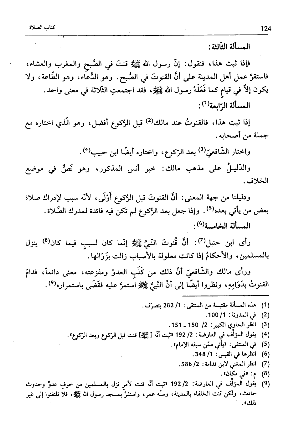 (¬9) يقول المؤلِّف في العارضة: 2/ 192 "ثبت أنّه قنت لأمر نزل بالمسلمين من خوفِ عدوٍّ وحدوث حادث، ولكن قنت الخلفاء بالمدينة، وسنّه عمر، واستقر بمسجد رسول الله - صلّى الله عليه وسلم -، فلا تلتفتوا إلى غير ذلك".