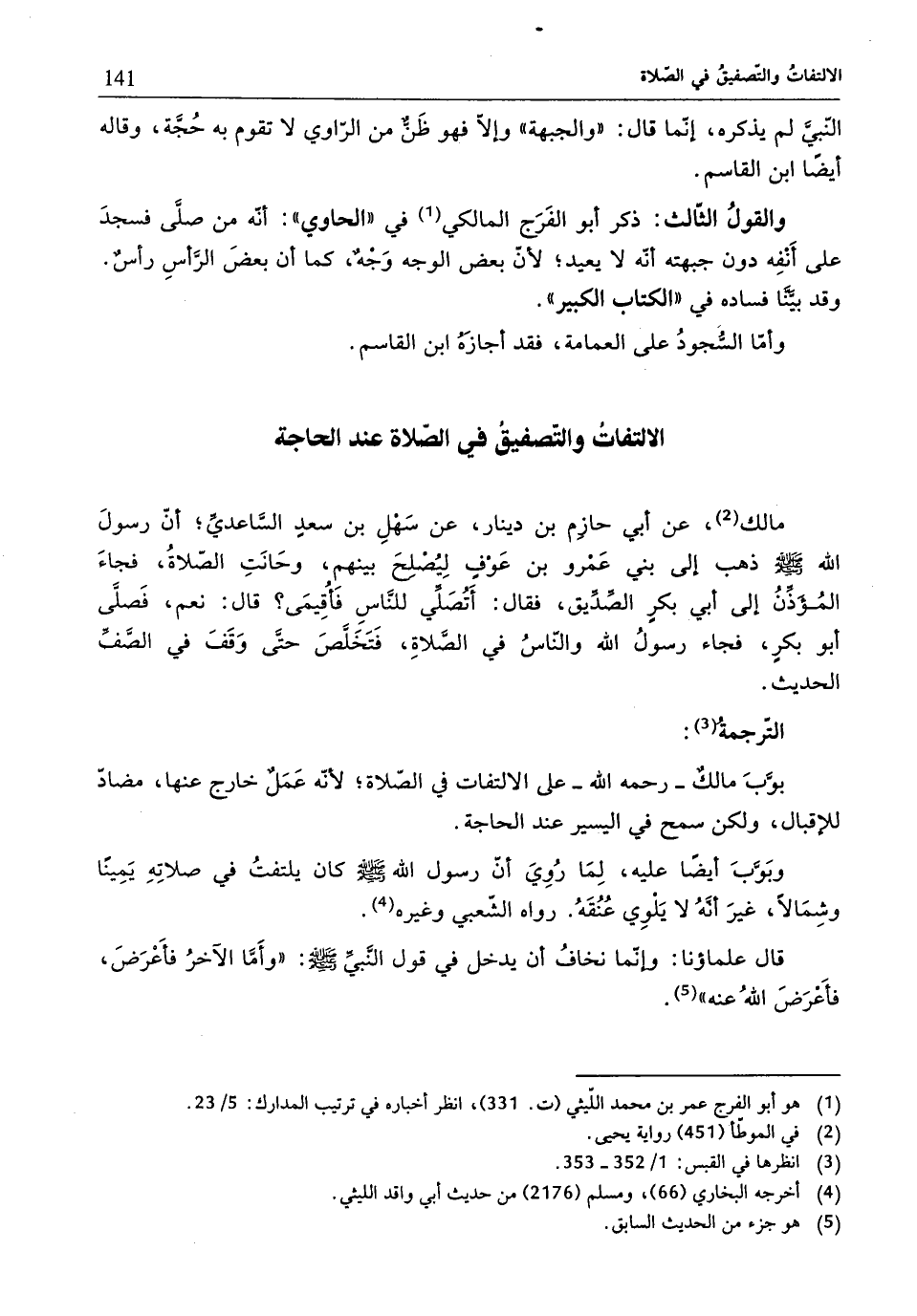 وبَوَّبَ أيضًا عليه، لِمَا رُوِيَ أنّ رسول الله - صلّى الله عليه وسلم - كان يلتفتُ في صلاتِهِ يَمِينًا وشِمَالًا، غيرَ أنَّهُ لا يَلْوِي عُنُقَهُ. رواه الشّعبي وغيره (¬4).