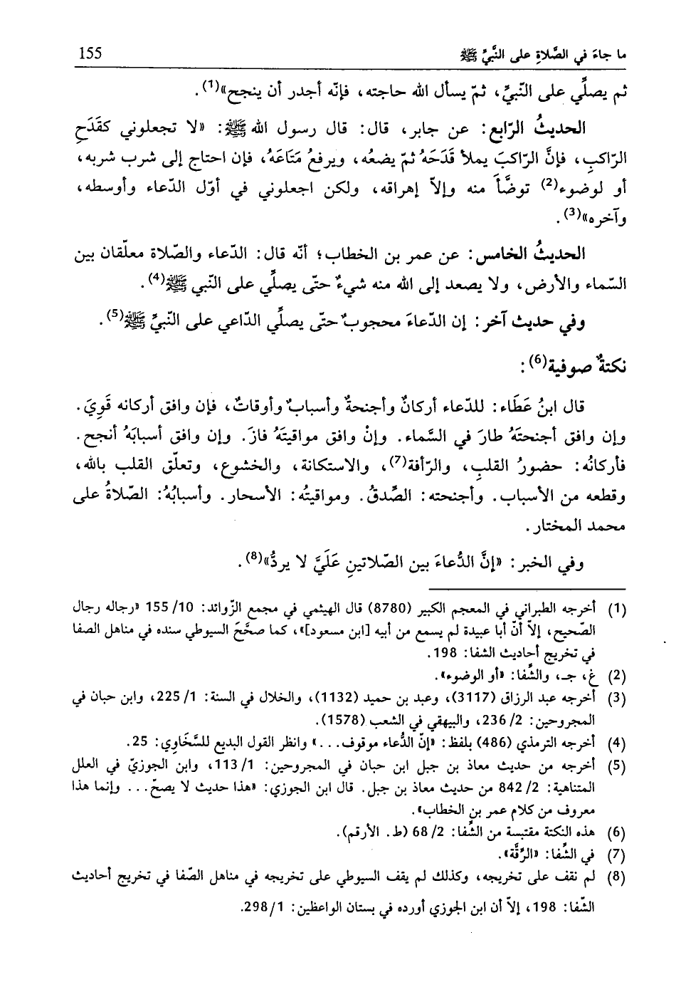 (¬1) أخرجه الطبراني في المعجم الكبير (8780) قال الهيثمي في مجمع الزّوائد: 10/ 155 "رجاله رجال الصّحيح، إلَّا أنّ أبا عبيدة لم يسمع من أببه [ابن مسعود] "، كما صحَّحَ السيوطي سنده في مناهل الصفا في تخريج أحاديث الشفا: 198.