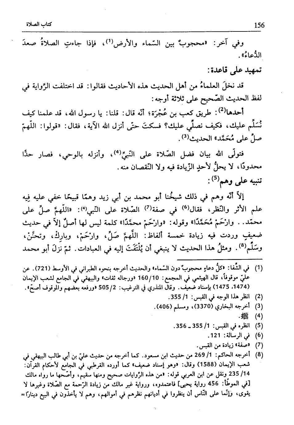 إلَّا أنّه وهم في ذلك شيخُنا أبو محمد بن أبي زيد وهمًا قبيحًا خفي عليه فِيه علم الأثر والنّظر، فقال (¬6) في صفة (¬7) الصَّلاة على النَّبيّ (4): "اللهمَّ صلِّ على محمّد .. وارْحَمْ مُحَمَّدًا" وقوله: "وارْحَمْ محمَّدًا" كلمة ليس لها أصلٌ إلَّا في حديث ضعيفِ وردت فيه زيادة خمسة ألفاظ: اللَّهمَّ صَلَّ، وارْحَمْ، وبارِكْ، وتحتَّنْ، وسَلِّم (¬8). ومثلُ هذا الحديث لا ينبغي أنّ يُلْتَفَتَ إليه في العبادات. ثمّ نزلَ أبو محمد