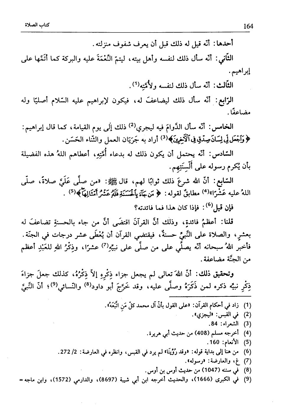 السّابع: أنّ الله شرعَ ذلك ثوابًا لهم، قال - صلّى الله عليه وسلم -: "من صلَّى عَلَيَّ صلاةً، صلّى اللهُ عليه عَشْرًا، (¬4) مطابقٌ لقوله: {مَنْ جَاءَ بِالْحَسَنَةِ فَلَهُ عَشْرُ أَمْثَالِهَا} (¬5).