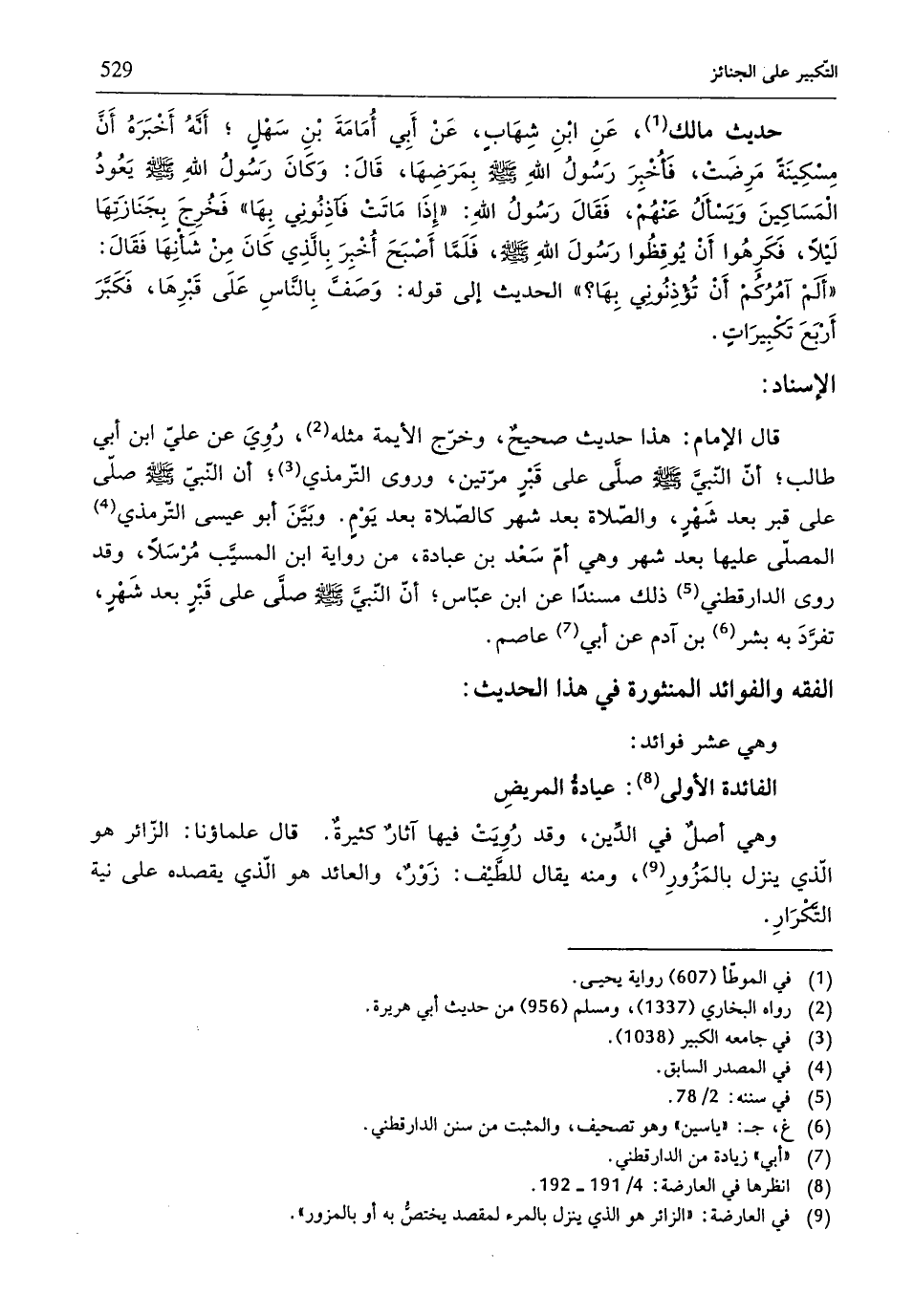 حديث مالك (¬1)، عَنِ ابن شِهَابٍ، عَنْ أَبِي أُمَامَةَ بْنِ سَهْلٍ؛ أَنَّهُ أَخْبَرَهُ أَنَّ مِسكِينَةُ مَرِضَتْ، فَاُخْبِرَ رَسُولُ اللهِ - صلّى الله عليه وسلم - بِمَرَضِهَا، قَالَ: وَكَانَ رَسُولُ اللهِ - صلّى الله عليه وسلم - يَعُودُ المَسَاكِينَ وَيَسألُ عَنْهُم، فَقَالَ رَسُولُ اللهِ: "إِذَا مَاتَتْ فَآذِنُونِي بِهَا" فَخُرِجَ بِجَنَازَتهَا لَيْلًا، فَكَرِهُوا أَنْ يُوقِظُوا رَسُولَ اللهِ - صلّى الله عليه وسلم -، فَلَمَّا أَصْبَحَ أُخْبِرَ بِالَّذِي كَانَ مِنْ شَأْنِهَا فَقَالَ: "أّلَمْ آمُرُكُم أَنْ تُؤْذِنُوني بِهَا؟ " الحديث إلى قوله: وَصَفَّ بِالنَّاسِ عَلَى قَبْرِهَا، فَكَبَّرَ أَربَعَ تَكْبِيرَاتٍ.
