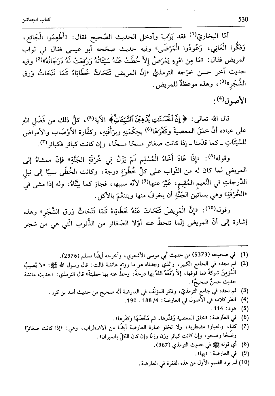 أمّا البخاريّ (¬1) فقد بَوَّبَ وأدخل الحديث الصّحيح فقال: "أَطْعِمُوا الْجَائع، وَفكُّوا الْعَانِي، وَعُودُوا الْمَرْضَى" وفيه حديث صحّحه أبو عيسى فقال في ثواب المريض فقال: "مَا مِن امرِءٍ يَمرَضُ إلَّا حُطَّتْ عَنْهُ سَيِّئَاتُهُ وَرُفِعَت لَهُ دَرَجَاتُه" (¬2) وفيه حديث آخر حسن خرّجه الترمذيُّ "إنّ المريض تَتَحَاتُّ خَطَايَاهُ كَمَا تَتَحَاتُ وَرق الشَّجَرِ" (¬3)، وهذه موعظةٌ للمريض.