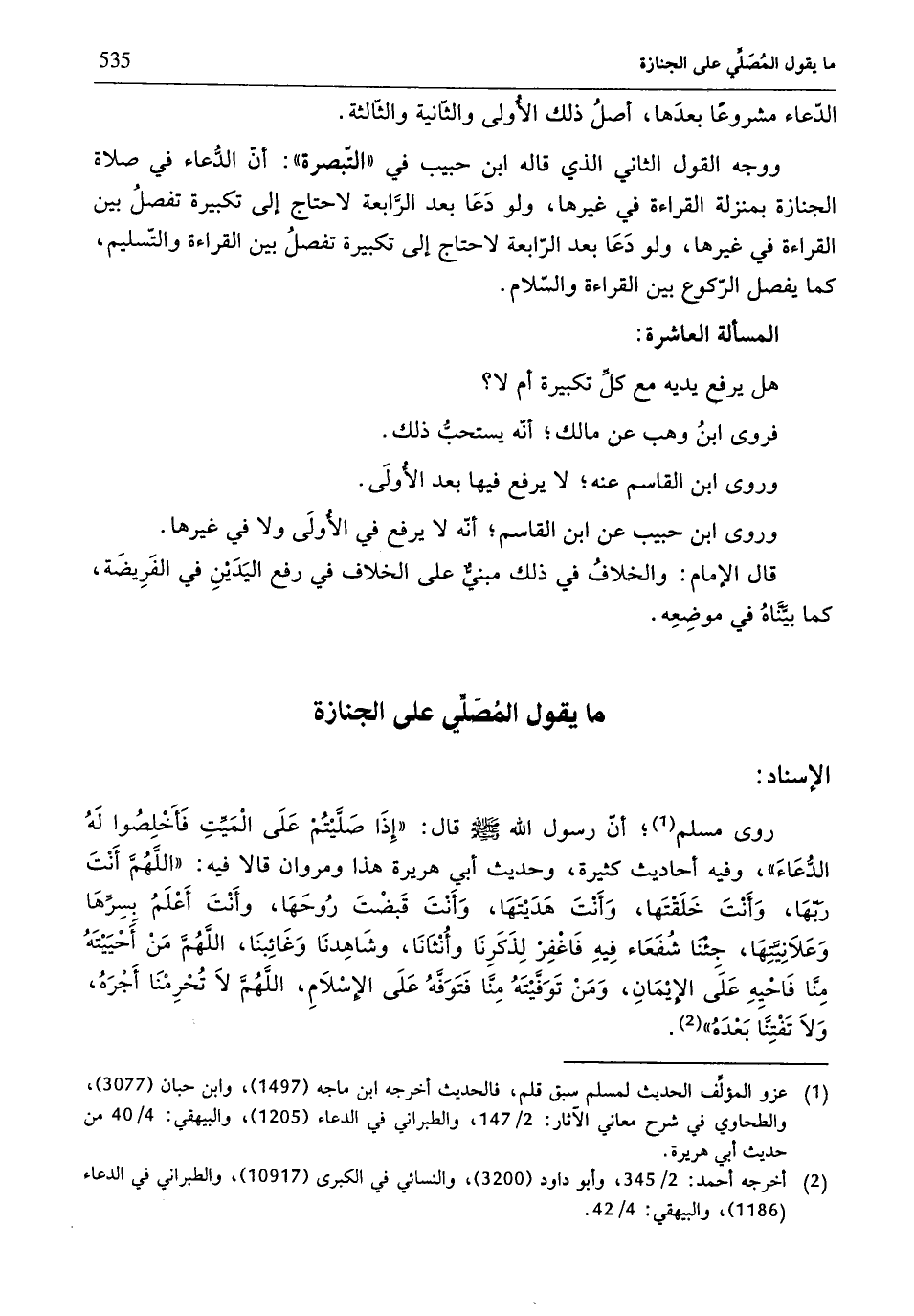 روى مسلم (¬1)؛ أنّ رسول الله - صلّى الله عليه وسلم - قال: "إِذَا صَلَّيْتُنم عَلَى الْمَيِّتِ فَأَخْلِصُوا لَهُ الدُّعَاءَ"، وفيه أحاديث كثيرة، وحديث أبي هريرة هذا ومروان قالا فيه: "اللَّهُمَّ أَنْتَ رَبّهَا، وَأَنْتَ خَلَقتَها، وَأَنْتَ هَدَيْتَهَا، وَأَنْتَ قَبضْتَ رُوحَهَا، وأَنْتَ أَعْلَمُ بسِرِّهَا وَعَلاَنِيِّهَا، جِئنا شُفَعَاء فِيهِ فَاغْفِر لِذَكَرِنَا وأُنْثانَا، وشَاهِدنَا وَغَائِبنَا، اللَّهُمَّ مَنْ أًحْيَيْتَهُ مِتا فَاحْيِهِ عَلَى الإيْمَانِ، وَمَنْ تَوَفَّيْتَهُ مِنَّا فَتَوَفَّهُ عَلَى الإسْلاَمِ، اللَّهُمَّ لَا تُحْرِمْنَا أَجْرَهُ، وَلاَ تَفْتِنَّا بَعدَهُ" (¬2).