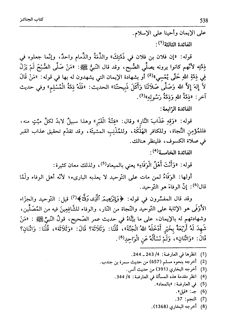 قوله: "إنّ فلان بن فلان في ذَمَّتِكَ" والذِّمَةُ والذِّمام واحدٌ، وإنّما جعلوه في ذِمَّتِه لأنّهم كانوا يرونه يصلِّي الصُّبح، وقد قال النّبيُّ - صلّى الله عليه وسلم -: "مَنْ صَلَّى الصُّبح لَمْ يَزَلْ في ذِمَّةِ اللهِ حَتَّى يُمْسِي" (¬2) أو بشهادة الإيمان الّتي يشهدون له بها في قوله: "مَنْ قَالَ لَا إِلهَ إِلا الله وصلَّى صَلَاتَنَا وَأَكَلَ ذَبِيحتَنَا" الحديث: "فَلَهُ ذِمَّةُ الْمُسْلِمِ" وفي حديث آخر: "ذِمَّةُ اللهِ وَذِمَّةُ رَسُولِهِ" (¬3).