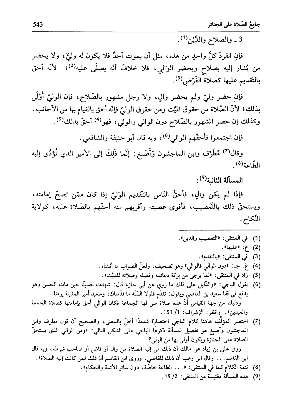 (¬7) اختصر المؤلِّف هاهنا كلام الباجي اختصارًا شديدًا أخل بالمعنى، والصحيح أنّ قول مطرف وابن الماجشون وأصبغ هو تفصيل لمسالة ذكرها الباجي على الشكل التالي: "ومن الوالي الّذي يستحقّ الصّلاة على الجنازة ويكون أولى بها من الولي؟