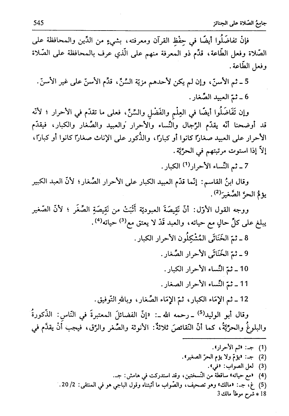وقال ابنُ القاسم: إنّما قدّم العبيد الكبار على الأحرار الصِّغار؛ لأنّ العبد الكبير يؤمُّ الحرَّ الصَّغيرَ (¬2).