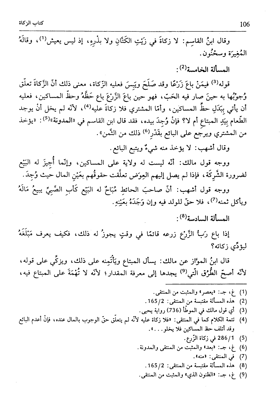 (¬4) تتمة الكلام كما في المنتقي: "فلا زكاة عليه لأنّه لم يتعلّق حق الوجوب بالمال عنده، فإنْ أعدم البائع وقد أتلف حظ المساكين فلا يخلو ... ".