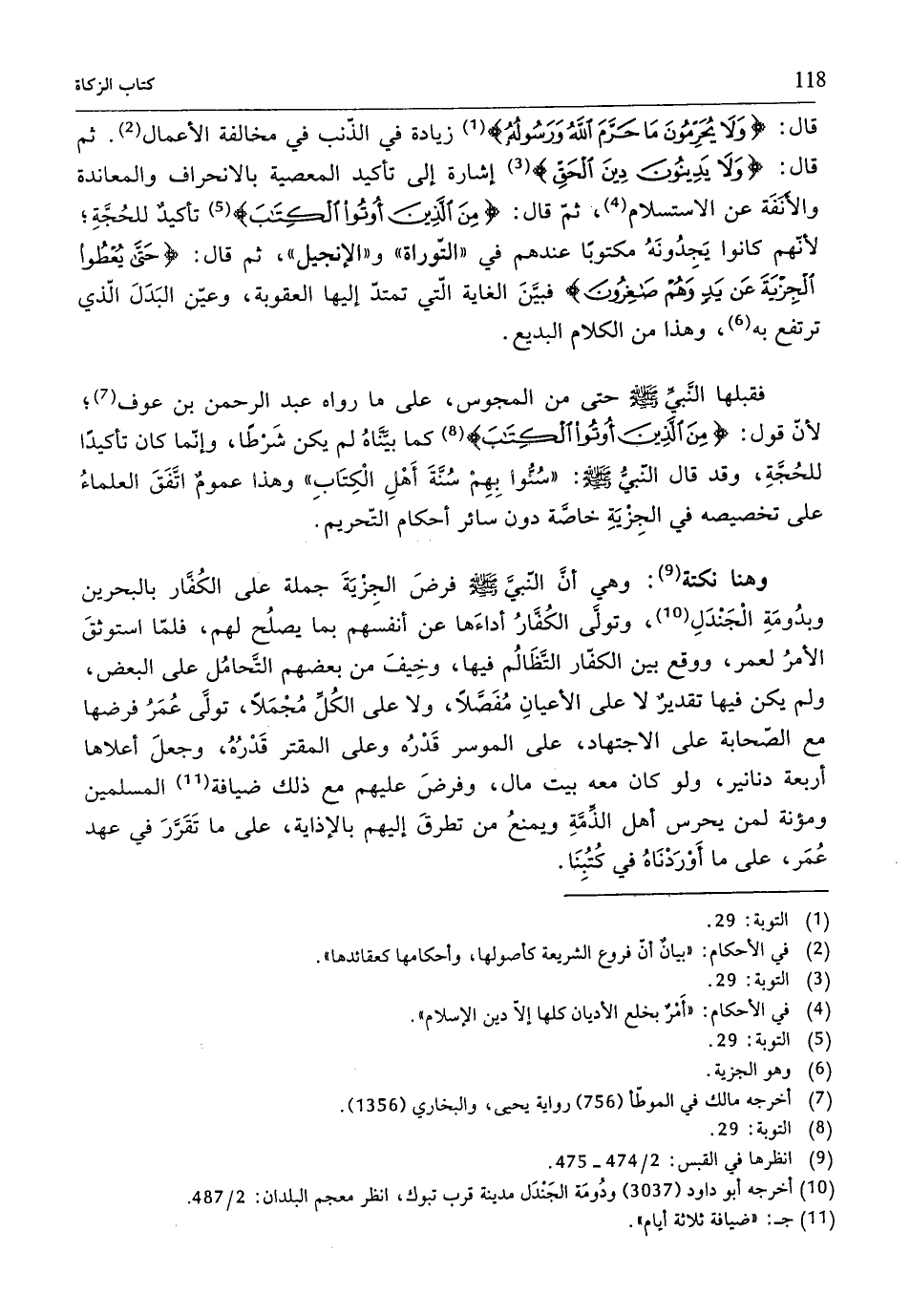 قال: {وَلَا يُحَرِّمُونَ مَا حَرَّمَ اللَّهُ وَرَسُولُهُ} (¬1) زيادة في الذّنب في مخالفة الأعمال (¬2). ثم قال: {وَلَا يَدِينُونَ دِينَ الْحَقِّ} (¬3) إشارة إلى تأكيد المعصية بالانحراف والمعاندة والأَنَفَة عن الاستسلام (¬4)، ثمّ قال: {مِنَ الَّذِينَ أُوتُوا الْكِتَابَ} (¬5) تأكيدٌ للحُجَّةِ؛ لأنّهم كانوا يَجِدُونَهُ مكتوبًا عندهم في "التّوراة" و"الإنجيل"، ثم قال: {حَتَّى يُعْطُوا الْجِزْيَةَ عَنْ يَدٍ وَهُمْ صَاغِرُونَ} فبيَّنَ الغاية الّتي تمتدّ إليها العقوبة، وعيّن البَدَلَ الّذي ترتفع به (¬6)، وهذا من الكلام البديع.