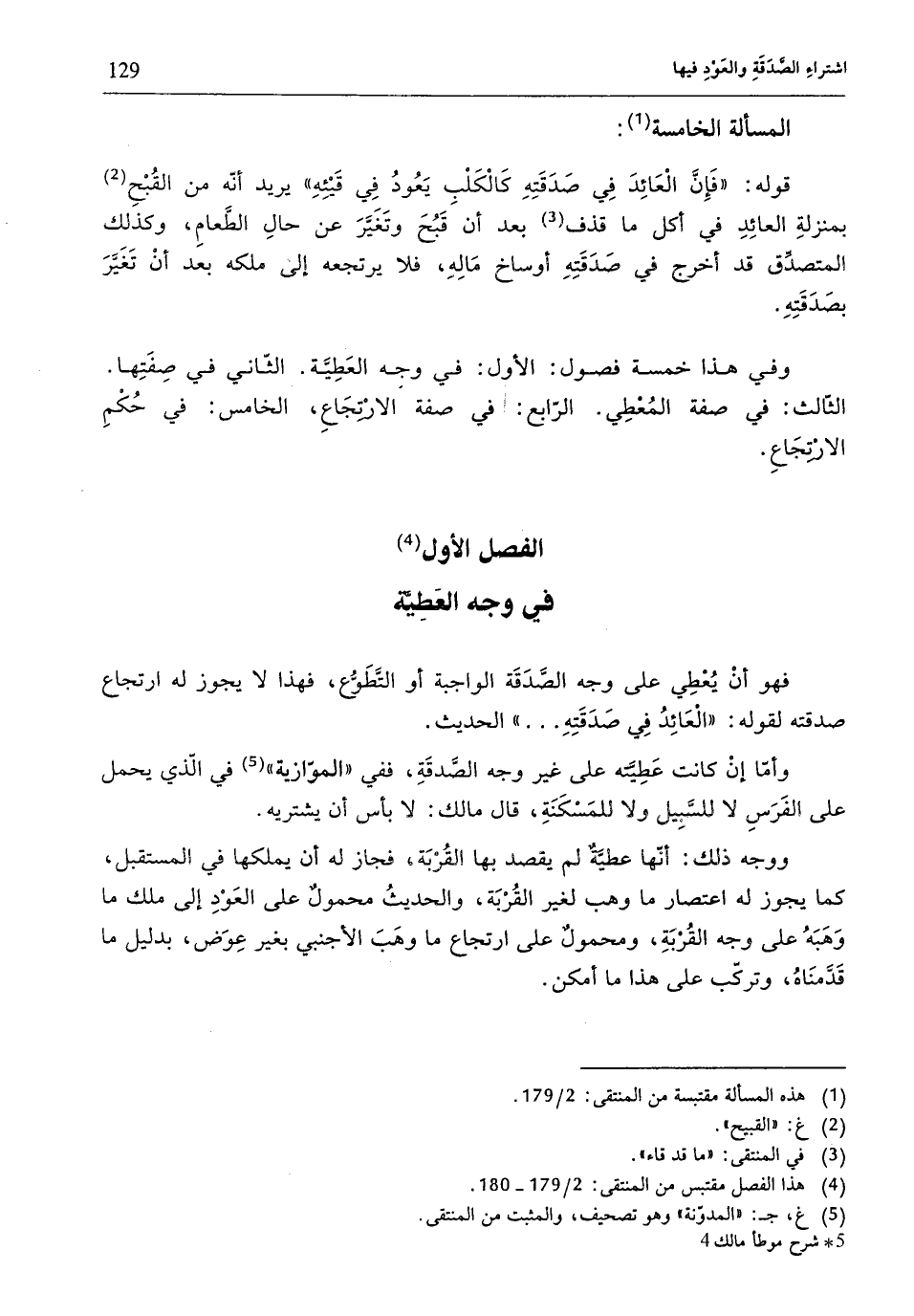 وفي هذا خمسة فصول: الأوّل: في وجه العَطِيَّة. الثّاني في صِفَتِها. الثّالث: في صفة المُعْطِي. الرّابع: في صفة الارْتِجَاعِ، الخامس: في حُكْمِ الارْتِجَاعِ.