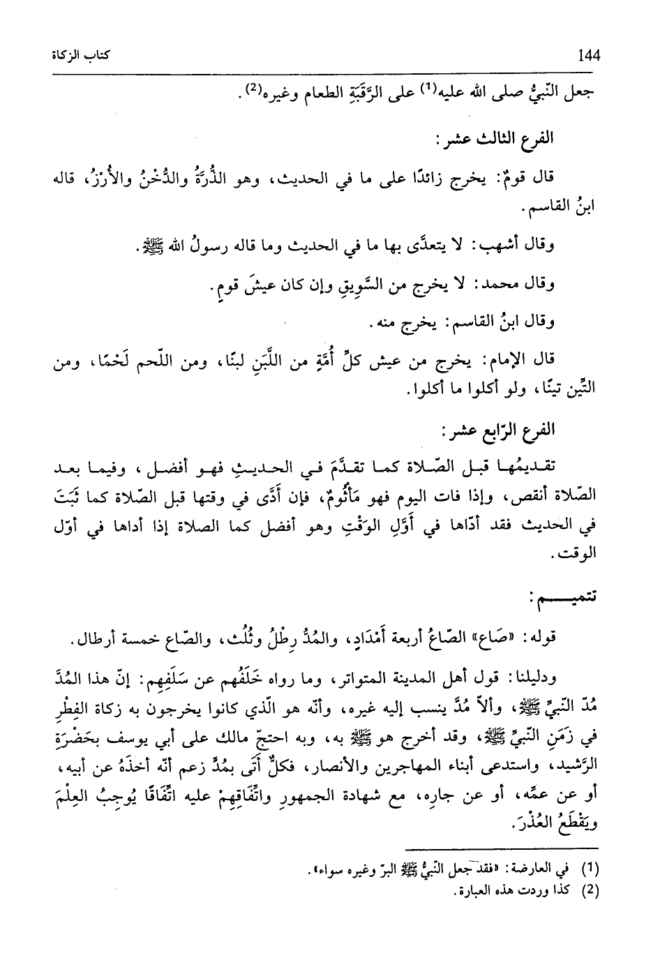 ودليلنا: قول أهل المدينة المتواتر، وما رواه خَلَفُهم عن سَلَفِهِم: إنّ هذا المُدَّ مُدّ النّبيِّ - صلّى الله عليه وسلم -، وألاّ مُدَّ ينسب إليه غيره، وأنّه هو الّذي كانوا يخرجون به زكاة الفِطْرِ في زَمَنِ النّبيِّ - صلّى الله عليه وسلم -، وقد أخرج هو - صلّى الله عليه وسلم - به، وبه احتجّ مالك على أبي يوسف بحَضْرَةِ الرَّشيد، واستدعى أبناء المهاجرين والأنصار، فكلٌّ أَتَى بمُدٍّ زعم أنّه أخذَهُ عن أبيه، أو عن عمِّه، أو عن جارِه، مع شهادة الجمهورِ واتِّفَاقِهِمْ عليه اتِّفَاقًا يُوجِبُ العِلْمَ ويَقْطَعُ العُذْرَ.