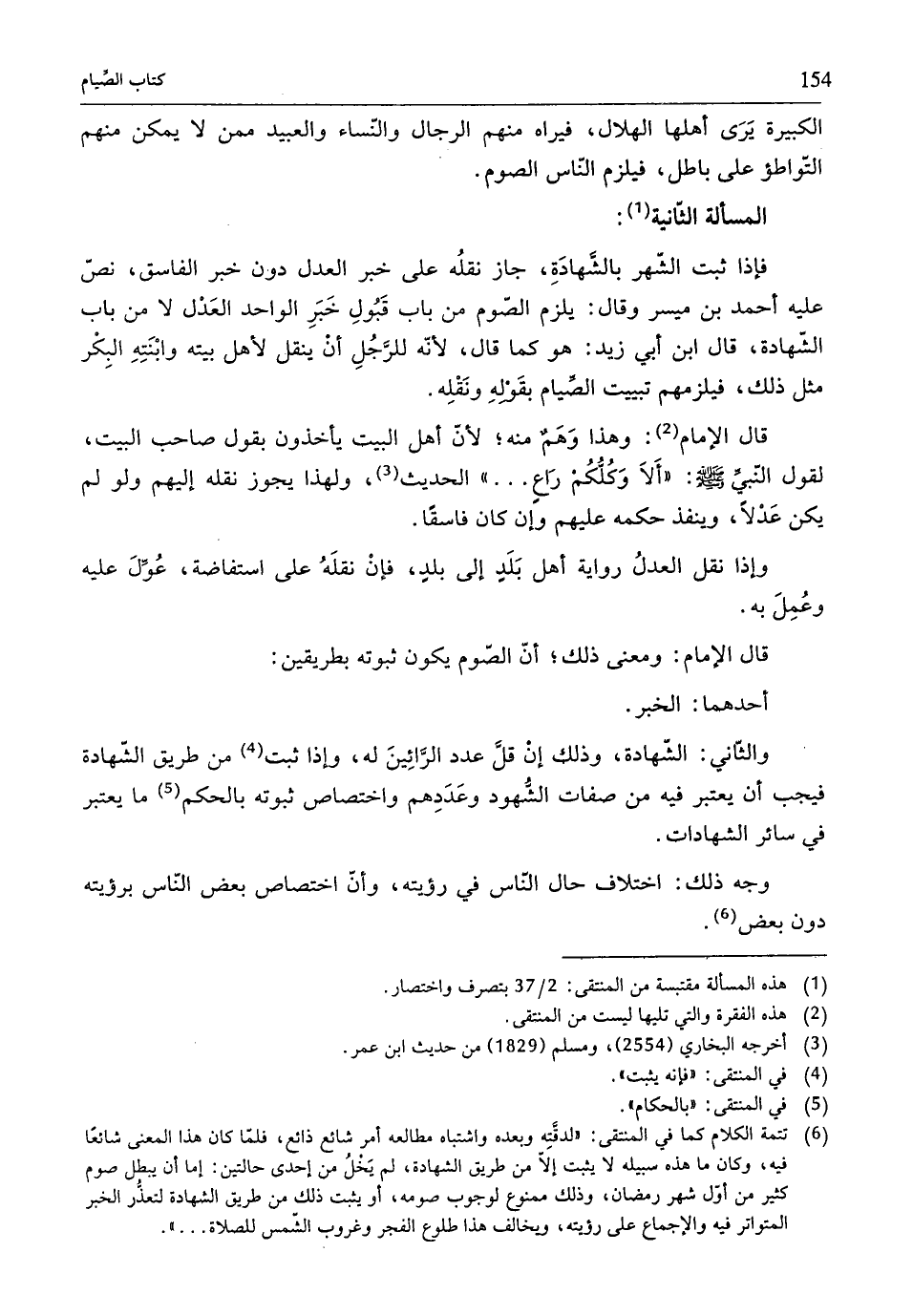 (¬6) تتمة الكلام كما في المنتقى: "لدقَّتِه وبعده واشتباه مطالعه أمر شائع ذائع، فلمّا كان هذا المعنى شائعًا فيه، وكان ما هذه سبيله لا يثبت إلَّا من طريق الشهادة، لم يَخْلُ من إحدى حالتين: إمّا أنّ يبطل صوم كثير من أوّل شهر رمضان، وذلك ممنوع لوجوب صومه، أو يثبت ذلك من طريق الشهادة لتعذُّر الخبر المتراتر فيه والإجماع على رؤيته، ويخالف هذا طلوع الفجر وغروب الشّمس للصلاة ... ".