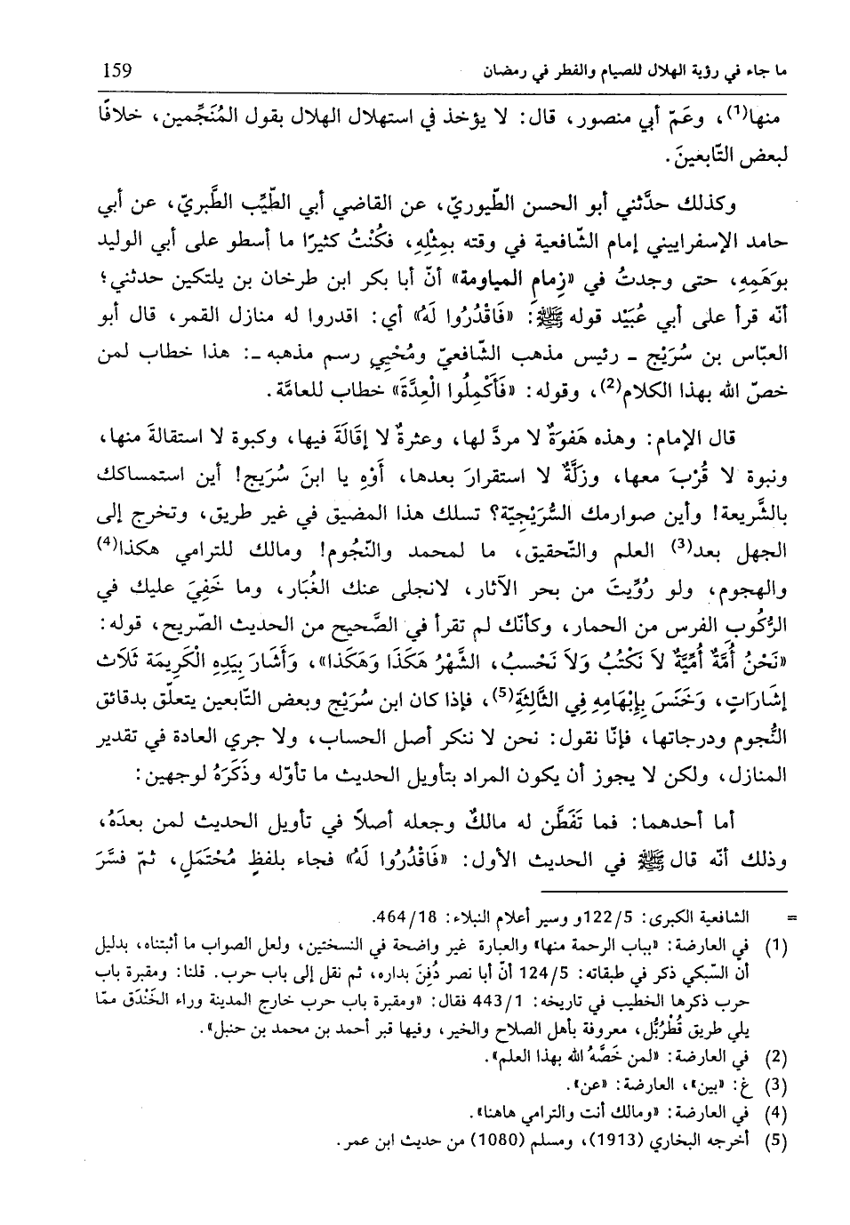 وكذلك حدَّثني أبو الحسن الطّيوريّ، عن القاضي أبي الطَّيِّب الطَّبريّ، عن أبي حامد الإسفراييني إمام الشّافعية في وقته بمِثْلِهِ، فكُنْتُ كثيرًا ما أسطو على أبي الوليد بوَهَمِهِ، حتّى وجدتُ في "زِمامِ المياومة" أنّ أبا بكر ابن طرخان بن يلتكين حدثني؛ أنّه قرأ على أبي عُبَيْد قوله - صلّى الله عليه وسلم -: "فَاقْدُرُوا لَهُ" أي: اقدروا له منازل القمر، قال أبو العبّاس بن سُرَيْج -رئيس مذهب الشّافعيّ ومُحْيِي رسم مذهبه-: هذا خطاب لمن خصّ الله بهذا الكلام (¬2)، وقوله: "فَأَكْمِلُوا الْعِدَّةَ" خطاب للعامَّة.