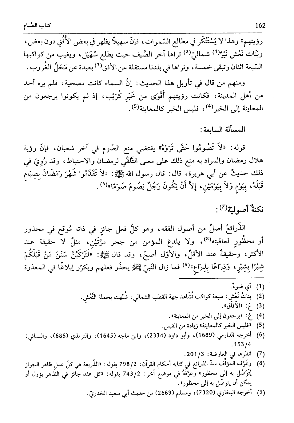 رؤيتهم" وهذا لا يُسْتنْكَر في مطالع السّموات، فإنّ سهيلًا يظهر في بعض الأُفُقِ دون بعض، وبَنَات نَعْش نَيْرٌ (¬1) شماليّ (¬2) تراها آخر الصَّيف حيث يطلع سُهَيْل، ويغيب من كواكبها السّبعة اثنان وتبقى خمسة، ونراها في بلدنا مستقلة عن الأُفُقِ (¬3) بعيدة عن مَحَلِّ الغُروب.