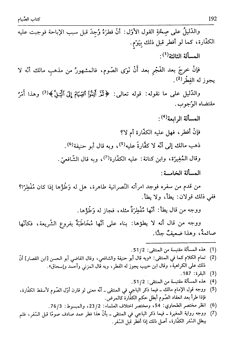 (¬2) تمام الكلام كما في المنتقى: "وبه قال أبو حنيفة والشّافعيّ، وقال القاضي أبو الحسن [ابن القصار] أنّ ذلك على الكراهية، وقال ابن حبيب يجوز له الفطر، وبه قال المزني وأحمد وإسحاق".