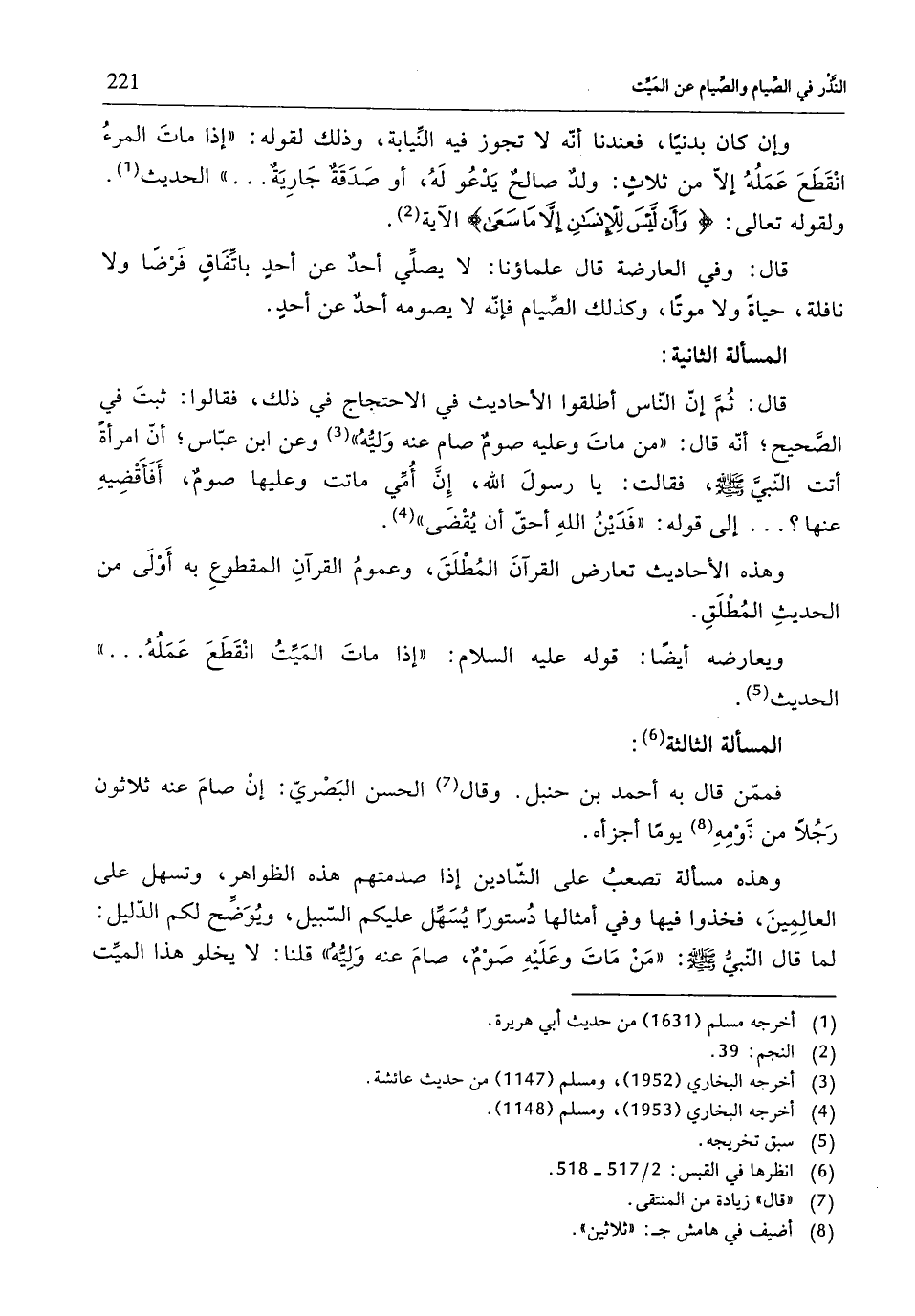 قال: ثُمّ إنّ النّاس أطلقوا الأحاديث في الاحتجاج في ذلك، فقالوا: ثبتَ في الصَّحيح؛ أنّه قال: "من ماتَ وعليه صومٌ صام عنه وَليُّهُ" (¬3) وعن ابن عبّاس؛ أنّ امرأةً أتت النّبيَّ - صلّى الله عليه وسلم -، فقالت: يا رسولَ الله، إِنَّ أُمِّي ماتت وعليها صومٌ، أَفَأَقْضيهِ عنها؟ ... إلى قوله: "فَدَيْنُ اللهِ أحقّ أنّ يُقْضى" (¬4).