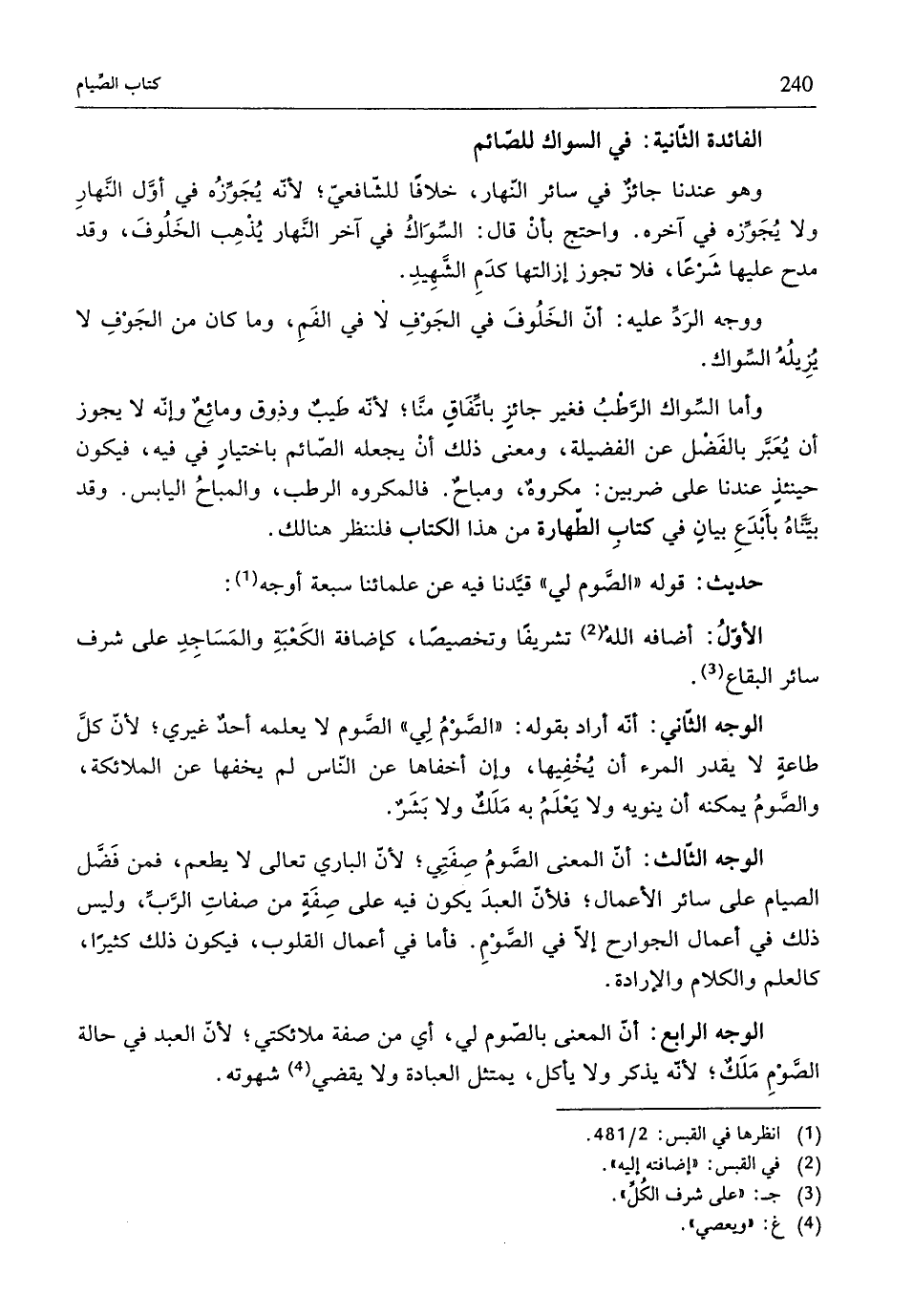 الوجه الثّاني: أنّه أراد بقوله: "الصَّوْمُ لِي" الصَّوم لا يعلمه أحدٌ غيري؛ لأنّ كلَّ طاعةٍ لا يقدر المرء أنّ يُخْفِيها، وإن أخفاها عن النّاس لم يخفها عن الملائكة، والصَّومُ يمكنه أنّ ينويه ولا يَعْلَمُ به مَلَكٌ ولا بَشَرٌ.