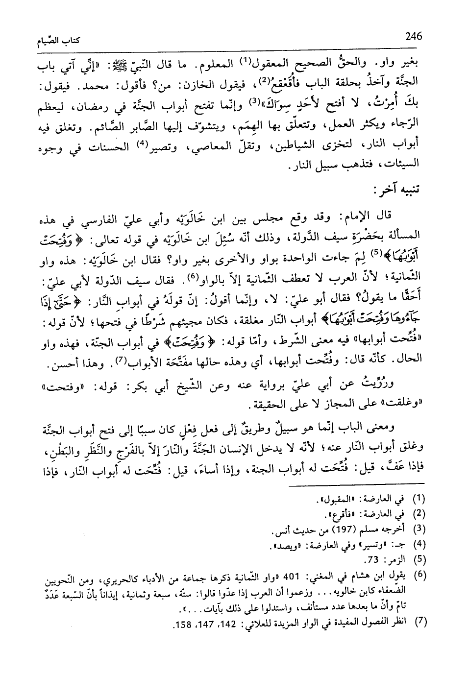 قال الإمام: وقد وقع مجلس بين ابن خَالَوَيْه وأبي على الفارسي في هذه المسألة بحَضْرَةِ سيف الدَّولة، وذلك أنَّه سُئِلَ ابن خَالَوَيْه في قوله تعالى: {وَفُتِحَتْ أَبْوَابُهَا} (¬5) لِمَ جاءت الواحدة بواو والأخرى بغير واو؟ فقال ابن خَالَوَيْه: هذه واو الثّمانية؛ لأنّ العرب لا تعطف الثّمانية إِلَّا بالواو (¬6). فقال سيف الدّولة لأبي علىّ: أَحَقًّا ما يقولُ؛ فقال أبو عليّ: لا، وإنّما أقولُ: إنّ قولَهُ في أبوابِ النّار: {حَتَّى إِذَا جَاءُوهَا وَفُتِحَتْ أَبْوَابُهَا} أبواب النّار مغلقة، فكان مجيئهم شَرْطًا في فتحها؛ لأنّ قوله: "فُتِّحت أبوابها" فيه معنى الشّرط، وأمّا قوله: {وَفُتِحَتْ} في أبواب الجنَّة، فهذه واو الحال. كأنّه قال: وفُتِّحت أبوابها، أي وهذه حالها مفَتَّحَة الأبواب (¬7). وهذا أحسن.