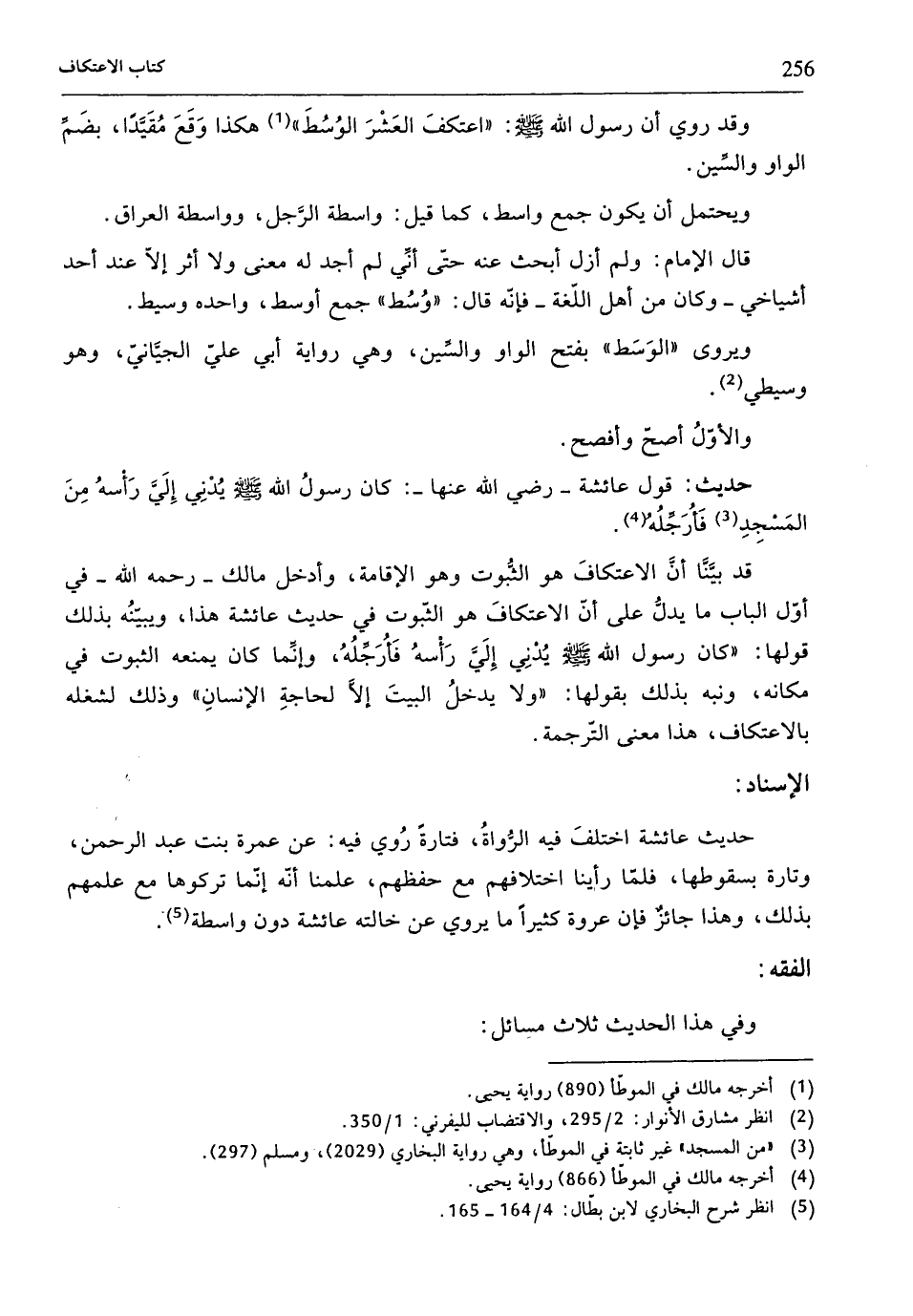 قد بيَّنَّا أنّ الاعتكافَ هو الثُّبوت وهو الإقامة، وأدخل مالك - رحمه الله - في أوّل الباب ما يدلُّ على أنّ الاعتكاف هو الثّبوت في حديث عائشة هذا، ويبيّنُه بذلك قولها: "كان رسول الله - صلّى الله عليه وسلم - يُدنِي إِلَيَّ رَأْسهُ فَاُرَجلُهُ، وإنَما كان يمنعه الثبوت في مكانه، ونبه بذلك بقولها: "ولا يدخلُ البيتَ إِلَّا لحاجةِ الإنسانِ" وذلك لشغله بالاعتكاف، هذا معنى التّرجمة.