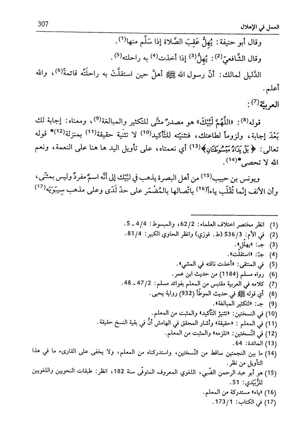 قوله (¬8): "اللَّهُمَّ لَبَّيْكَ" هو مصدرٌ مثَّنى للتكثير والمبالغة (¬9)، ومعناه: إجابة لك بَعْدَ إجابة، ولزومًا لطاعتك، فتثنيّته للتَّأكيد (¬10) لا تثنية حقيقة (¬11) بمنزلة (¬12) * قوله تعالى: {بَلْ يَدَاهُ مَبْسُوطَتَانِ} (¬13) أي نعمتاه، على تأويل اليد ها هنا على النعمة، ونعم الله لا تحصى* (¬14).