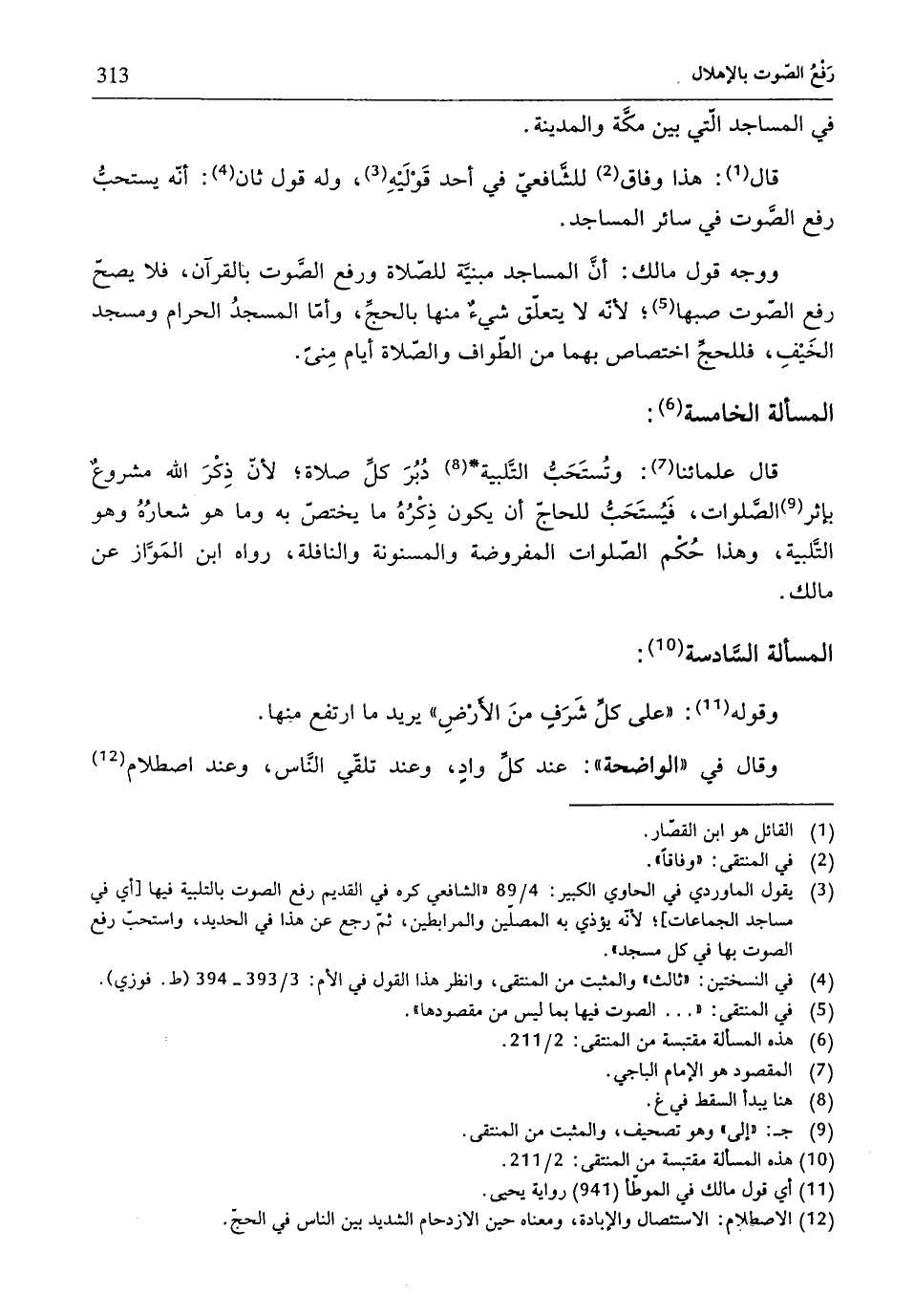 (¬3) يقول الماوردي في الحاوي الكبير: 4/ 89 "الشّافعيّ كره في القديم رفع الصوت بالتلبية فيها [أي في مساجد الجماعات]؛ لأَنّه يؤذي به المصلّين والمرابطين، ثمّ رجع عن هذا في الجديد، واستحبّ رفع الصوت بها في كل مسجد".