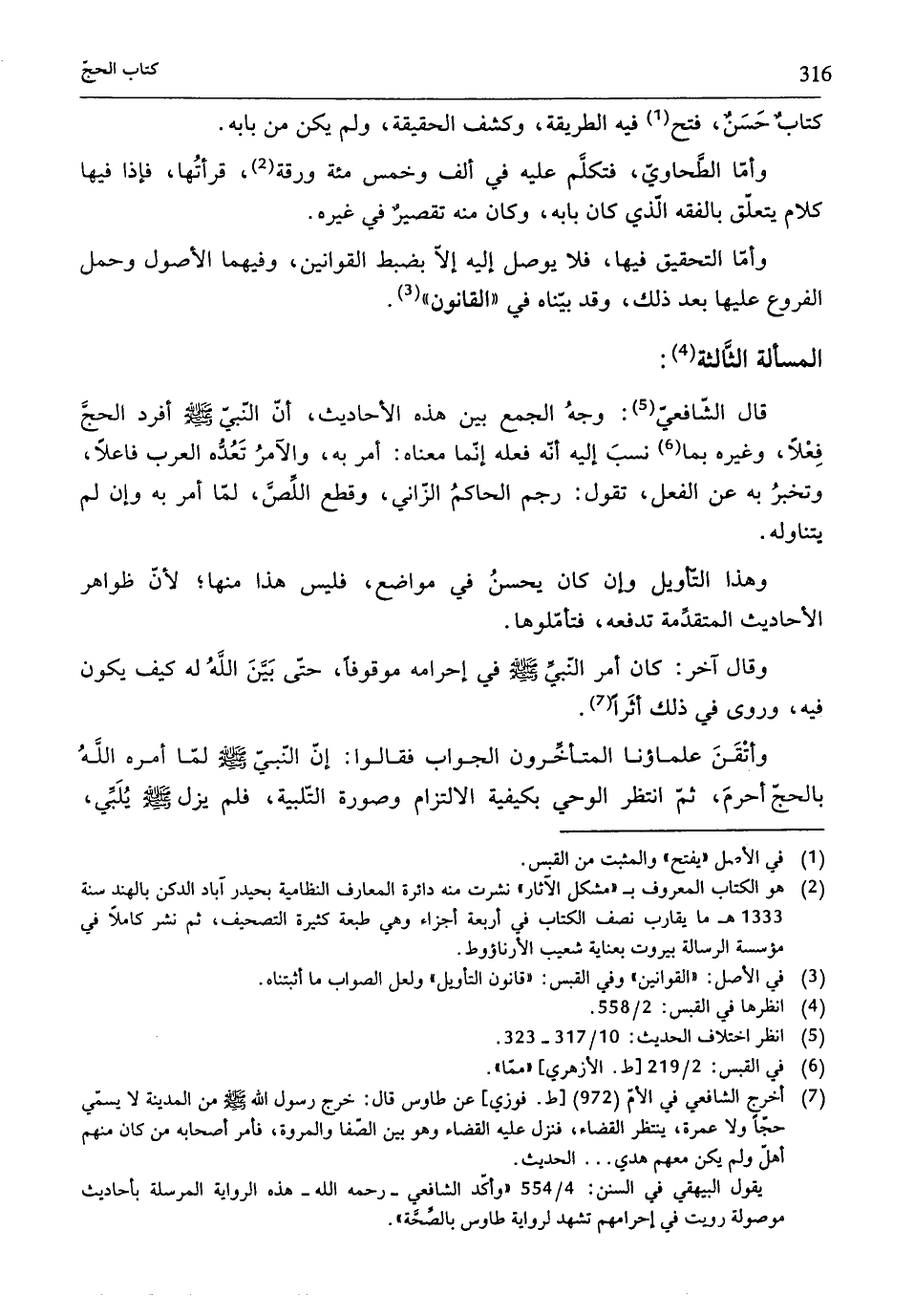 (¬7) أخرج الشّافعيّ في الأمّ (972) [ط. فوزي] عن طاوس قال: خرج رسول الله - صلّى الله عليه وسلم - من المدينة لا يسمِّي حجًّا ولا عمرة، ينتظر القضاء، فنزل عليه القضاء وهو بين الصّفا والمروة، فأمر أصحابه من كان منهم أهلّ ولم يكن معهم هدي ... الحديث.