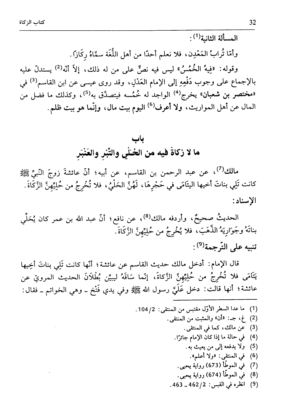 قال الإمام: أدخل مالكٌ حديث القاسم عن عائشة؛ أنّها كانت تَلِي بناتَ أخِيها يَتَامَى فلا تُخْرِجُ من حُلِيِّهِن الزَّكاةَ، إنّما سَاقَهُ ليبيِّن بُطْلاَنَ الحديث المرويّ عن عائشة؛ أنّها قالت: دخل عَلَيَّ رسول الله - صلّى الله عليه وسلم - وفي يدي فَتخ -وهي الخواتم- فقال: