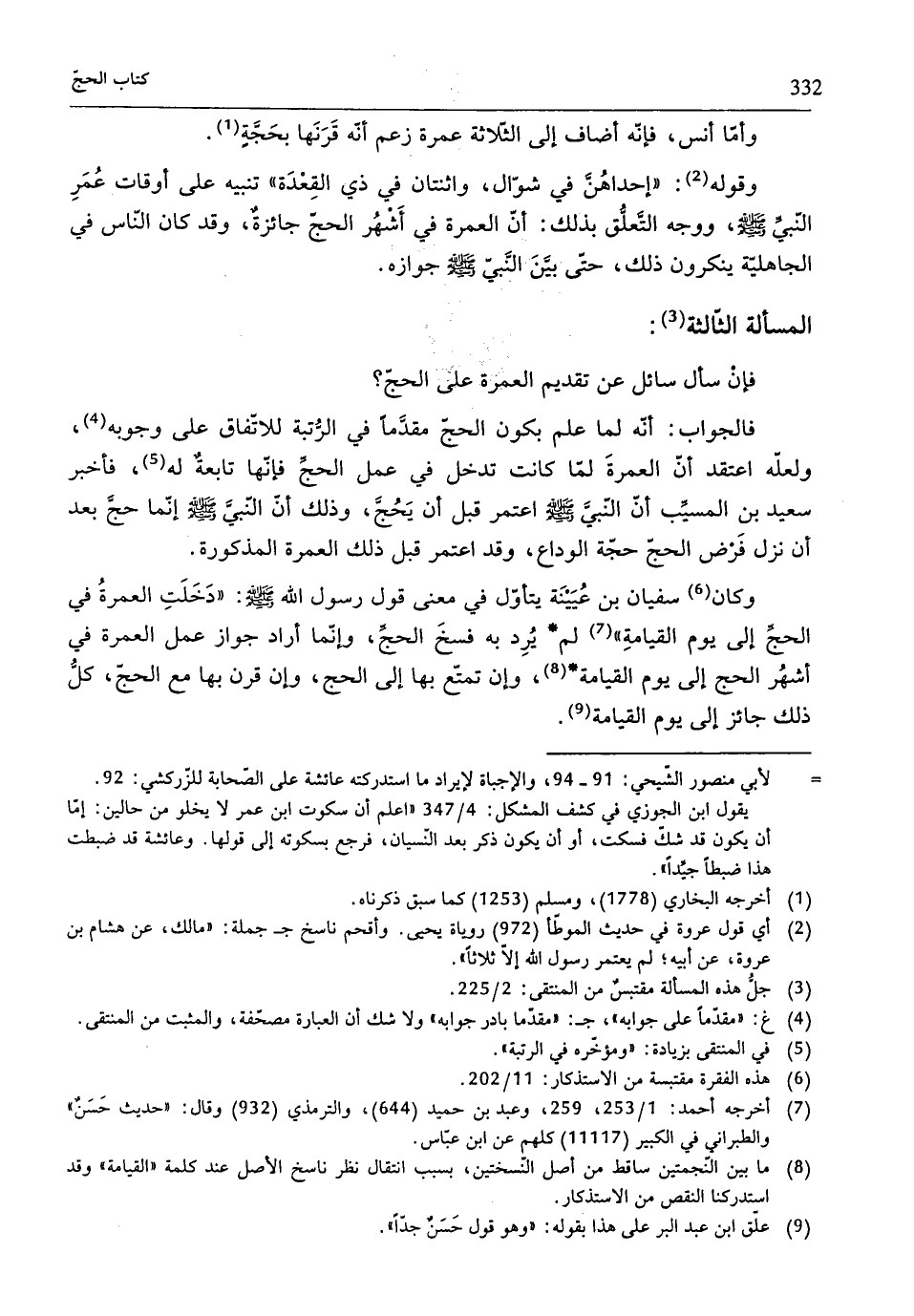 وكان (¬6) سفيان بن عُيَيْنَة يتأوّل في معنى قول رسول الله - صلّى الله عليه وسلم - "دَخَلَتِ العمرةُ في الحجِّ إلى يوم القيامةِ" (¬7) لم * يُرِد به فسخَ الحجِّ، وإنّما أراد جواز عمل العمرة في أشهُر الحجّ إلى يوم القيامة* (¬8)، وإن تمتّع بها إلى الحجّ، وإن قرن بها مع الحجّ، كلُّ ذلك جائز إلى يوم القيامة (¬9).