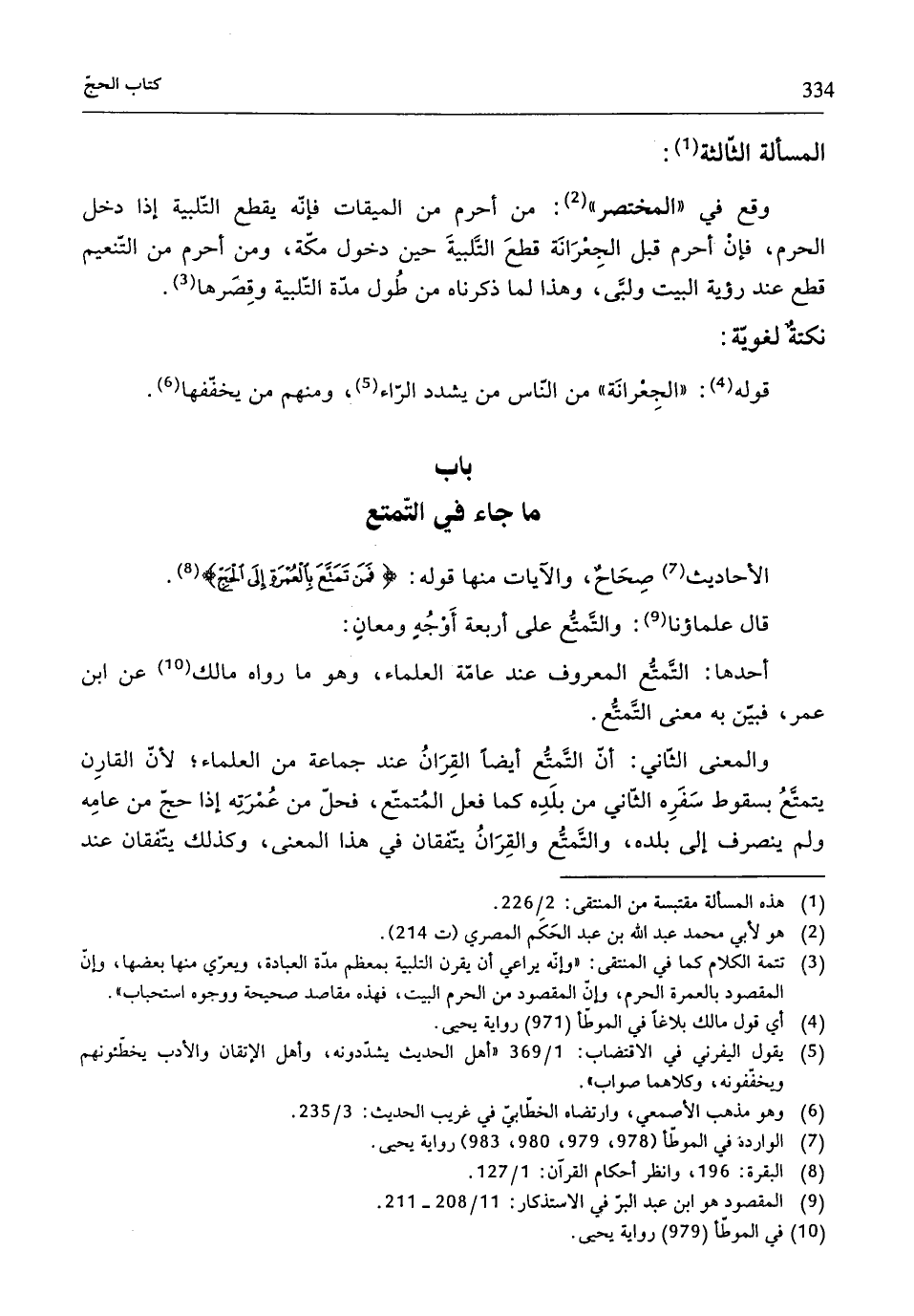 (¬3) تتمة السّلام كما في المنتقى: "وإنّه يراعي أنّ يقرن التلية بمعظم مدّة العبادة، ويعرّي منها بعضها، وإنّ المقصود بالعمرة الحرم، وإنّ المقصود من الحرم البيت، فهذه مقاصد صحيحة ووجوه استحباب".