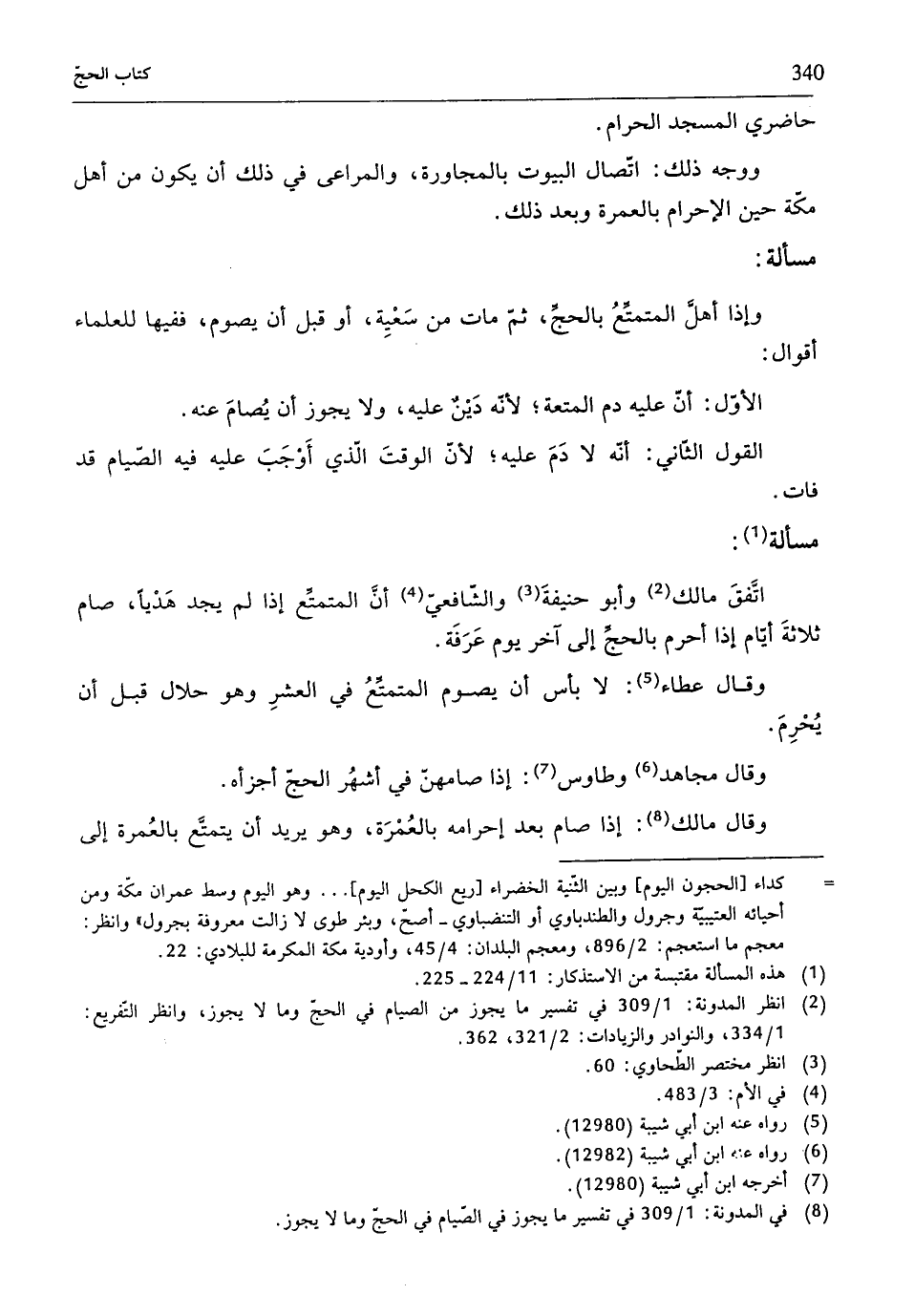 (¬2) انظر المدونة: 1/ 309 في تفسير ما يجوز من الصِّيام في الحجّ وما لا يجوز، وانظر التّفريع: 1/ 334، والنوادر والزيادات: 2/ 321، 362.