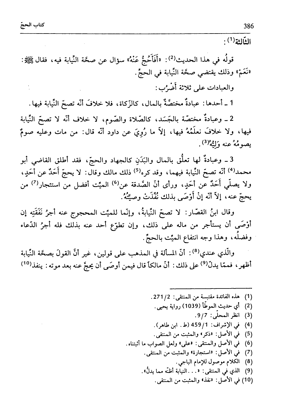 3 - وعبادةٌ لها تعلُّق بالمال والبَدَنِ كالجهاد والحجّ، فقد أطلق القاضي أبو محمّد (¬4) أنّه تصحّ النِّيابة فيهما، وقد كره (¬5) ذلك مالك وقال: لا يحجّ أَحَدٌ عن أحَدٍ، ولا يصلّي أَحَدٌ عن أحَدٍ، ورأى أنّ الصَّدقة عن (¬6) الميِّت أفضل من استئجار (¬7) من يحجّ عنه، إِلَّا أنّه إنْ أَوْصَى بذلك نُفِّذَتْ وصيَّتُهُ.