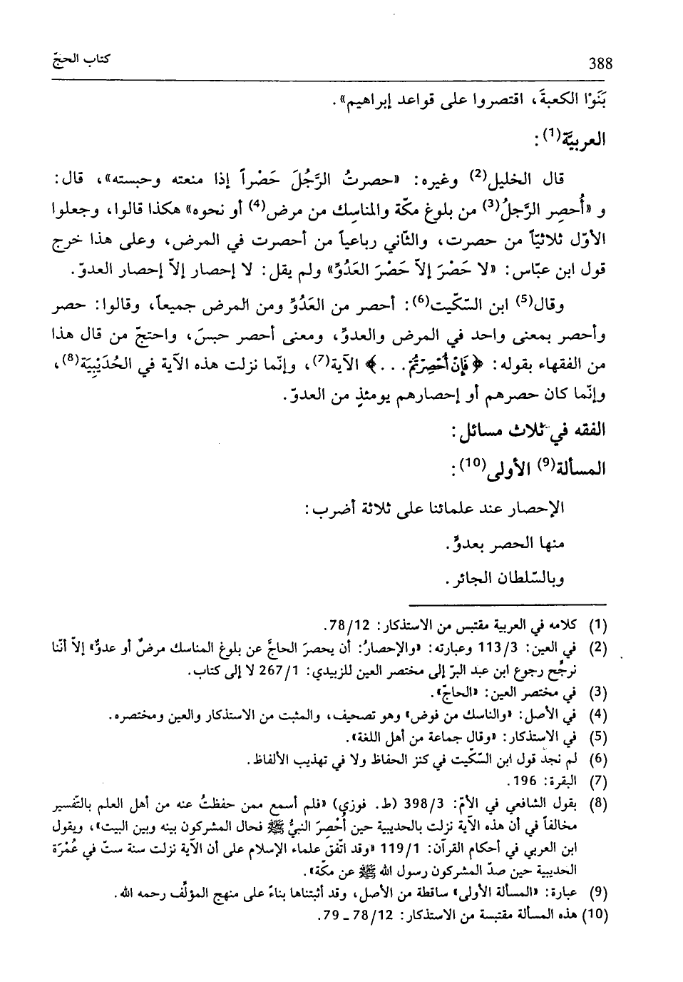 (¬2) في العين: 3/ 113 وعبارته: "والإحصارُ: أنّ يحصرَ الحاجَّ عن بلوغ المناسك مرضٌ أو عدوٌّ" إلّا أنّنا نرجِّح رجوع ابن عبد البرّ إلى مختصر العين للزبيدي: 1/ 267 لا إلى كتاب.